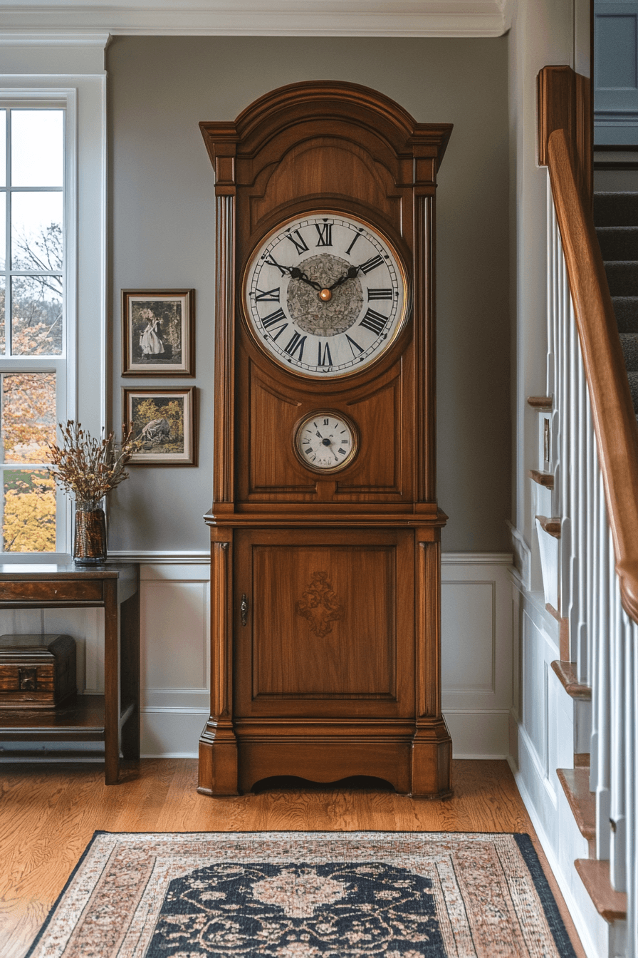 Among the most classic antique farmhouse decor ideas is a stately grandfather clock gracing the entryway. Its steady tick and vintage chime fill the home with old-fashioned warmth and grandeur. The carved wood and timeless face instantly capture attention. It’s both functional and sentimental, standing as a proud symbol of heritage.