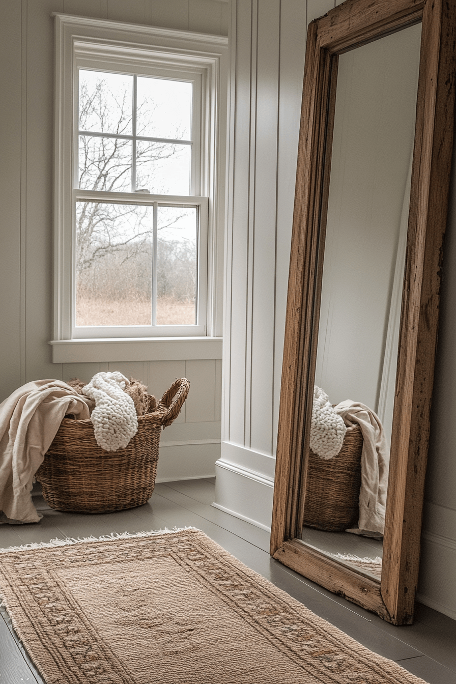 A distressed wood mirror is one of the most versatile antique farmhouse decor ideas for any room. The rustic texture and weathered frame reflect natural light beautifully, brightening your space with character. Each imperfection adds to its timeless story. Whether in a hallway or bedroom, it enhances that farmhouse charm effortlessly.