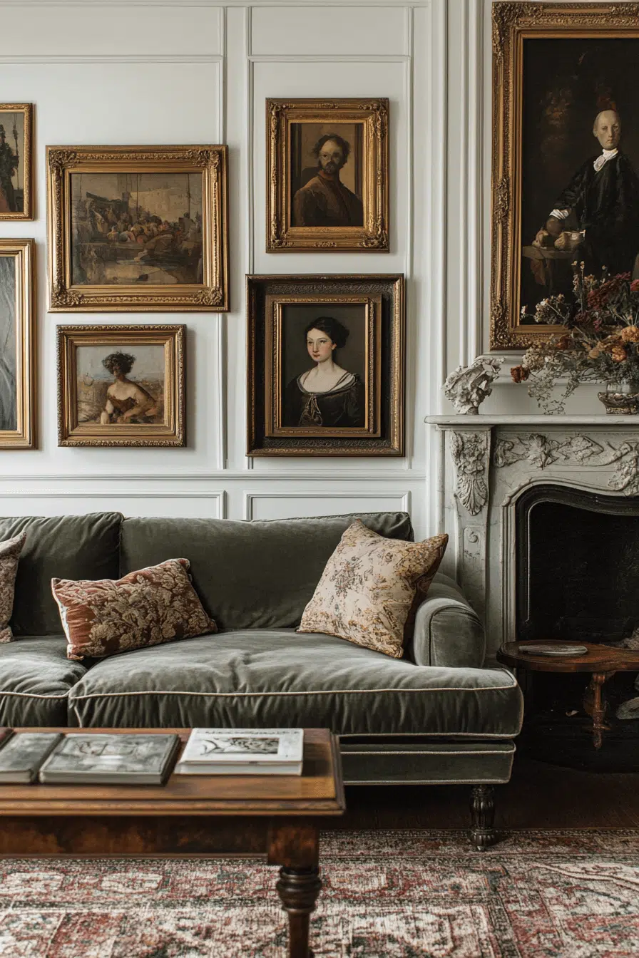Antique gallery wall styling celebrates history through a curated mix of vintage frames, portraits, and collected artwork. Each piece contributes a layer of personality and depth, essential in a well-designed antique interior. Use symmetrical arrangements for a stately look or go eclectic for a collected-over-time feel. Antique sconces or moldings enhance the display and add architectural interest. This technique works beautifully in hallways, libraries, or above fireplaces. Click to curate your own antique-inspired gallery!