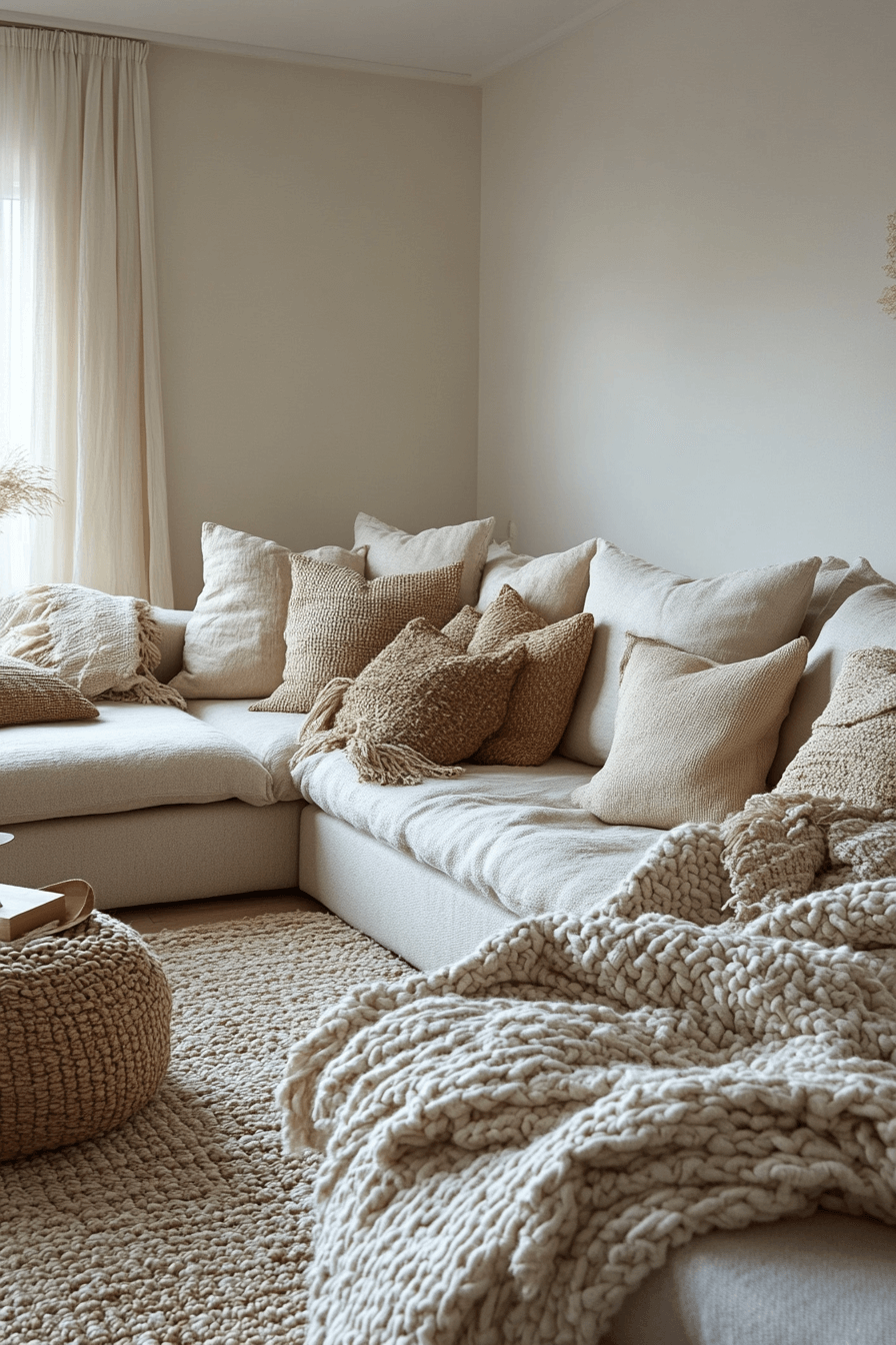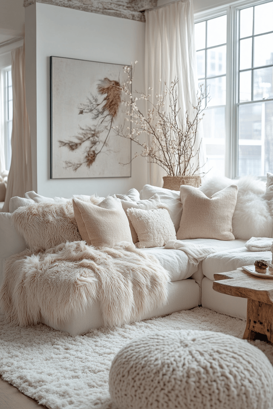 Faux fur, velvet, and knits meet ivory and blush for a luxe apartment aesthetic cozy setting that feels indulgent yet approachable. Light colors keep it airy while rich textures add sophistication and depth. Enhance the ambiance with gold-toned lighting or mirrored accents to reflect warmth. This is comfort you can see, touch, and feel every day.