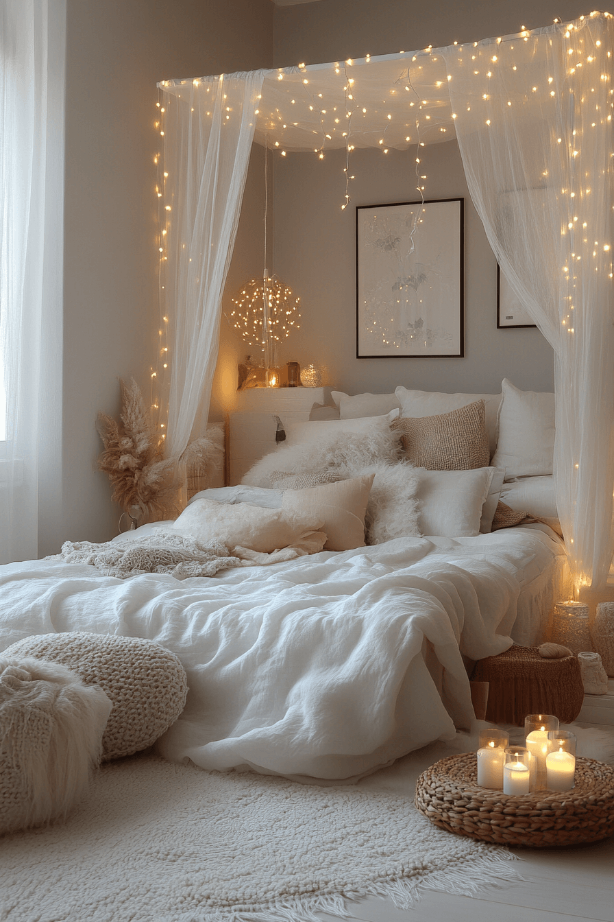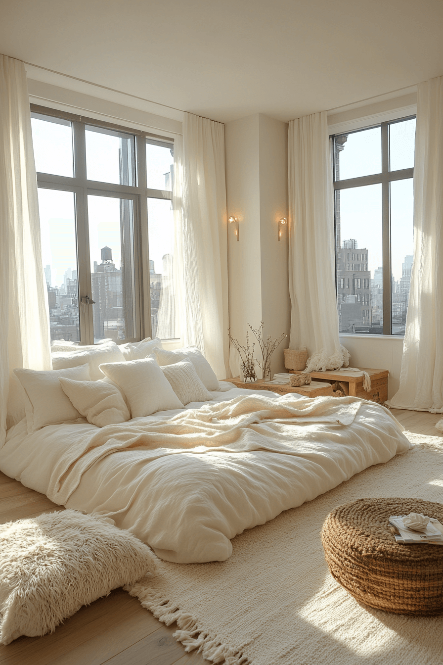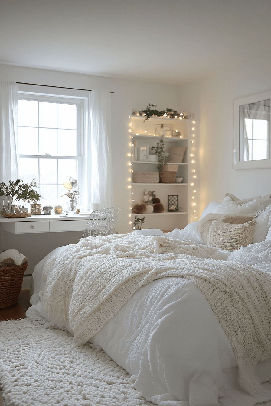 Cream and white shades merge to create a dreamy, cloud-like apartment aesthetic cozy feel. Textured bedding and plush accents keep it soft yet sophisticated. Subtle tone variations add dimension without bright colors. Light, airy, and totally livable.