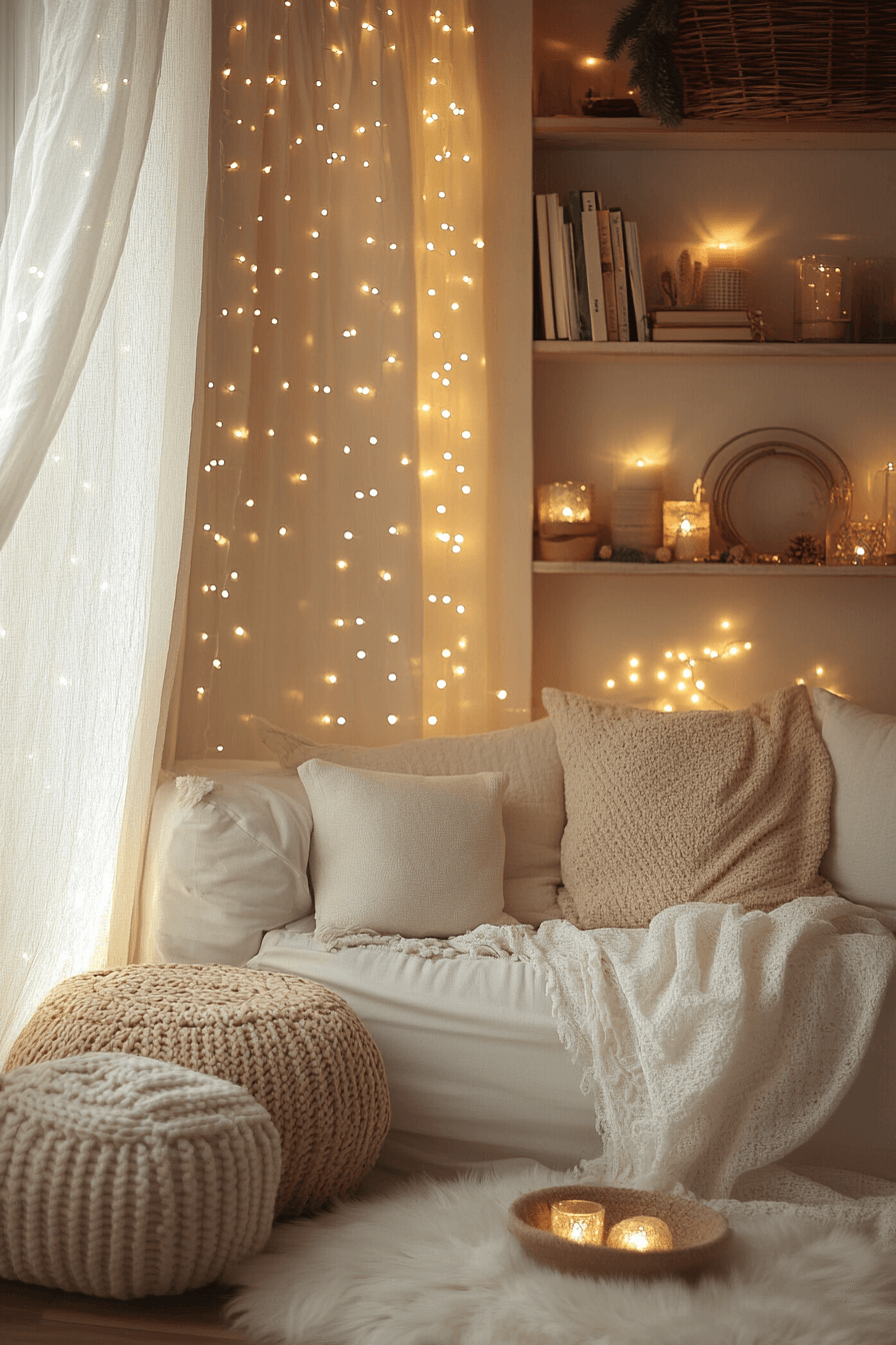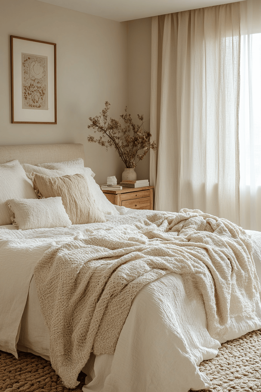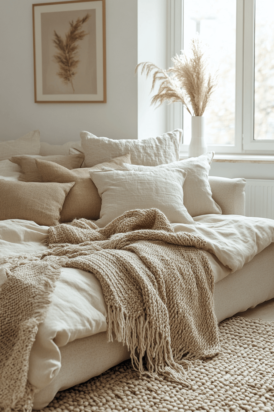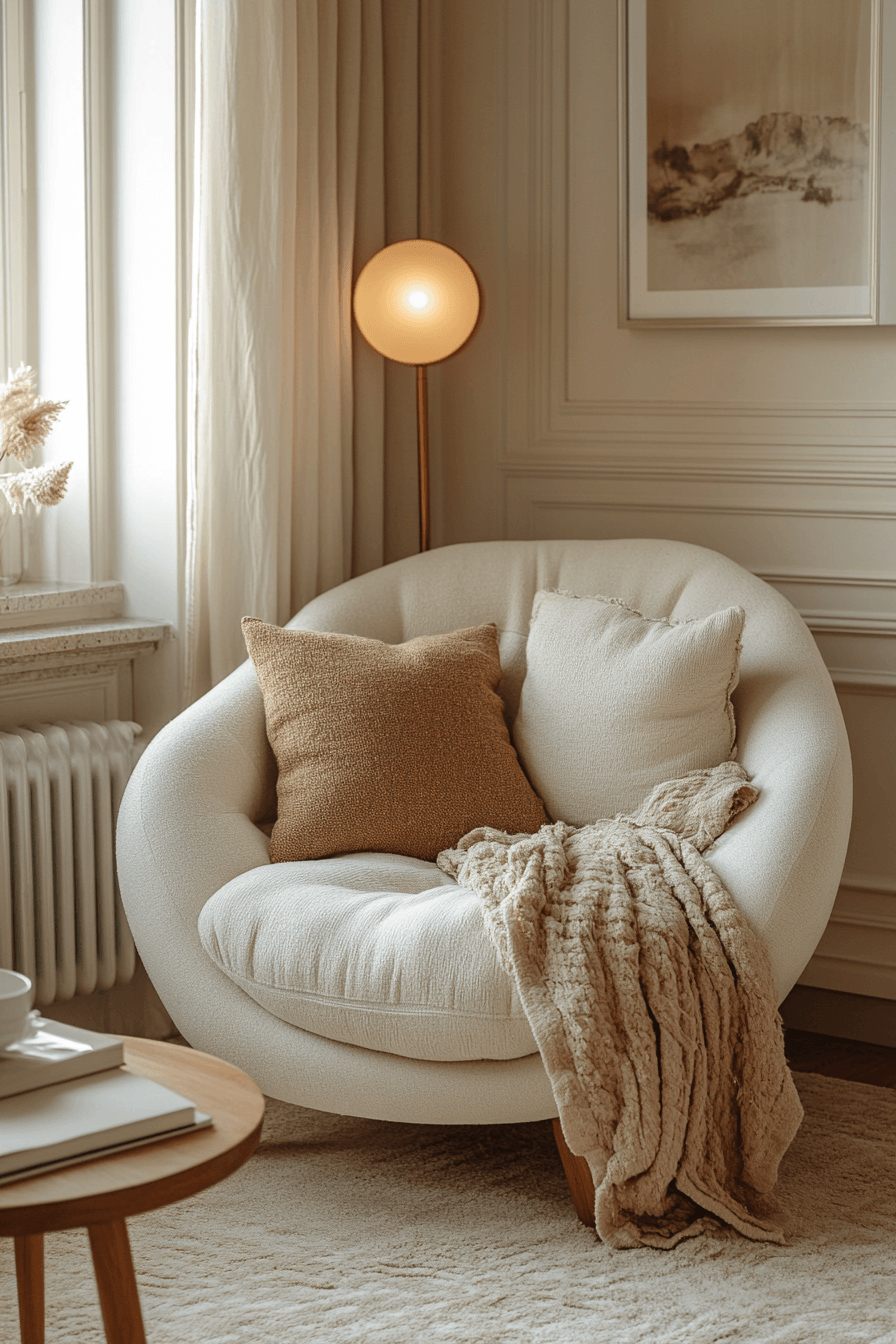 Cream walls, soft bedding, and plush throws turn a corner into an apartment aesthetic cozy retreat that’s hard to leave. Warm lighting completes the snug and inviting feel. Add small decor touches like candles or framed art for a personal stamp. Perfect for unwinding anytime in a compact, calm space.