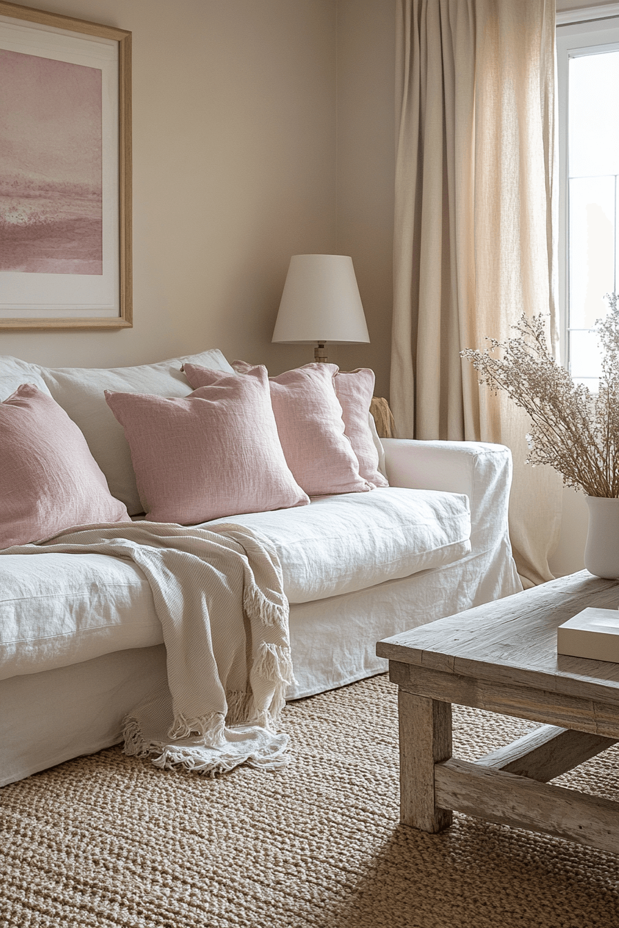 Romantic yet grounded, soft pink meets natural linen for a balanced apartment aesthetic cozy look that feels timeless. Light fabrics and curated furniture choices keep the design breezy and approachable. Add woven baskets or ceramic accents for warmth without excess. Perfect for restful, inviting spaces that welcome you in.