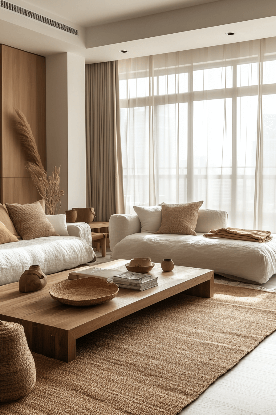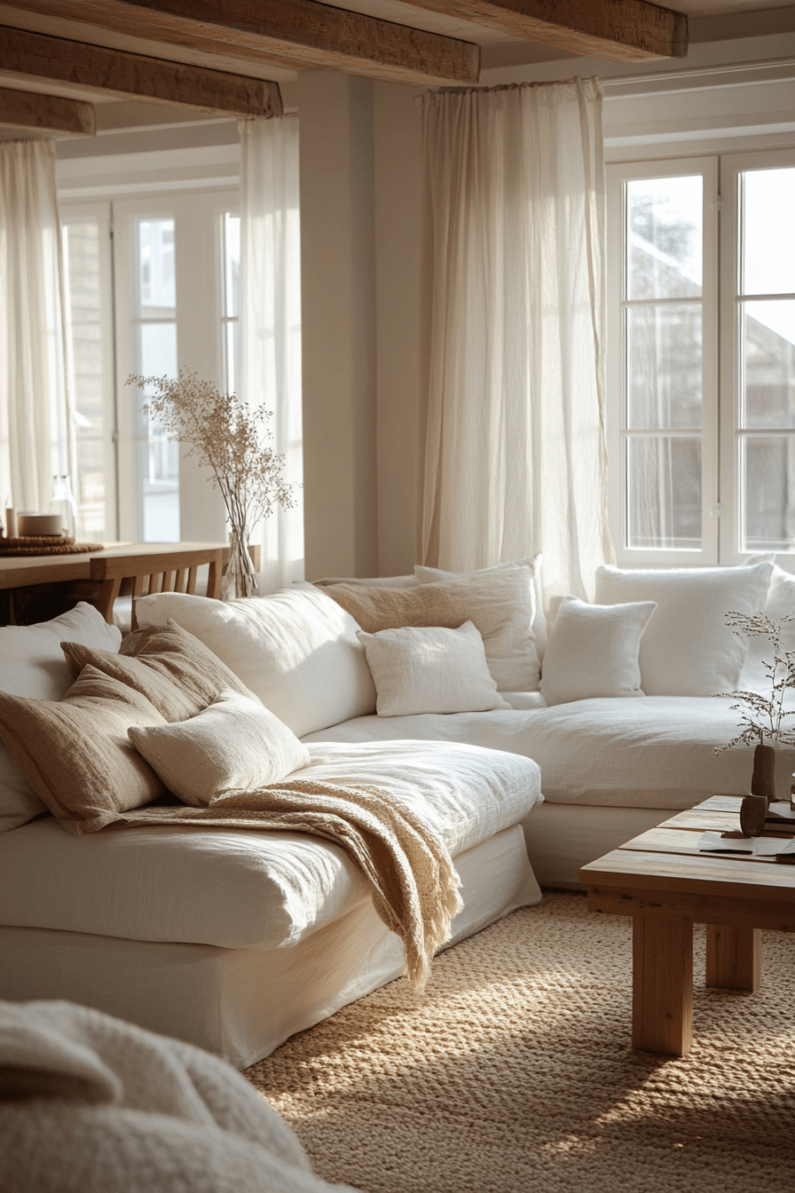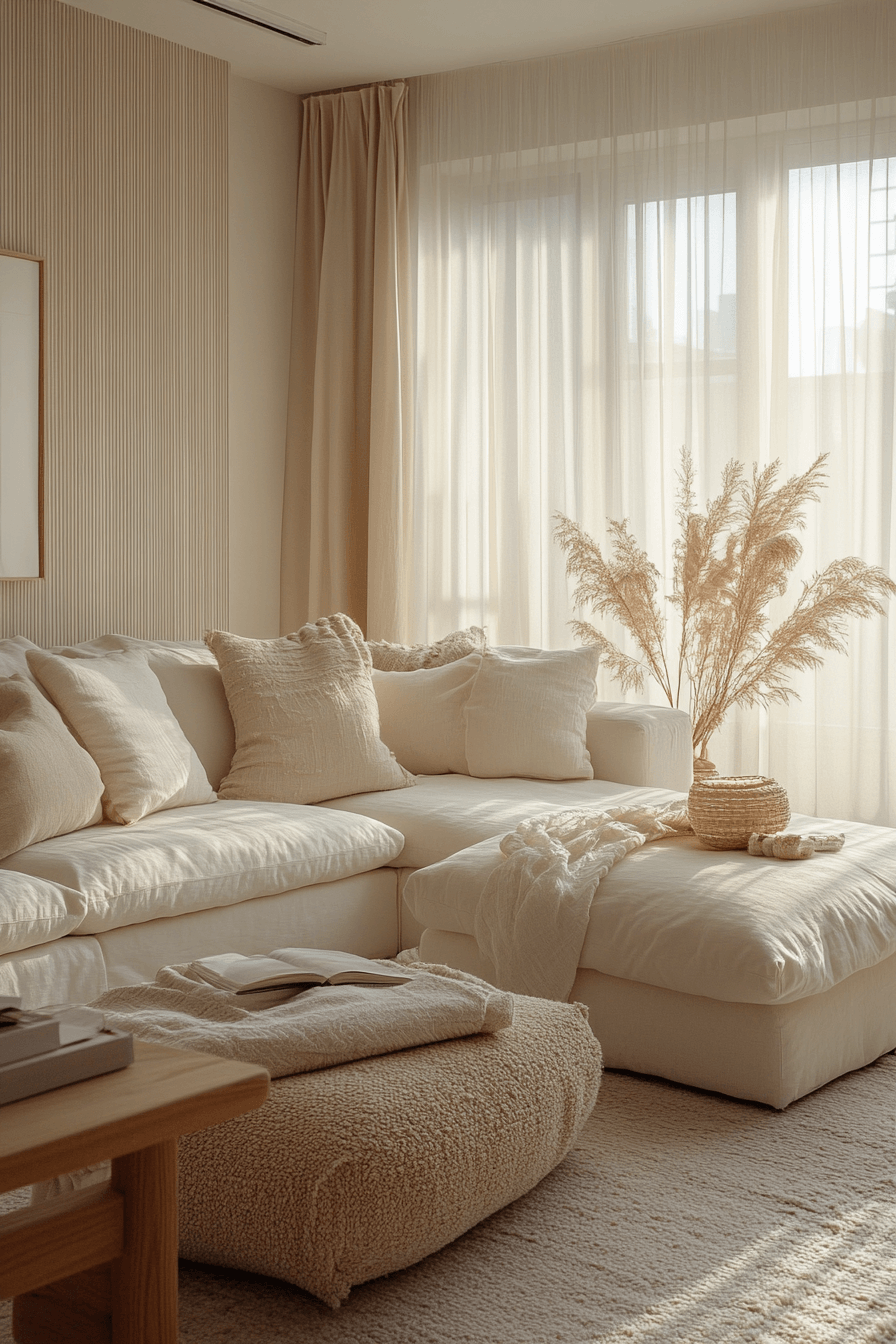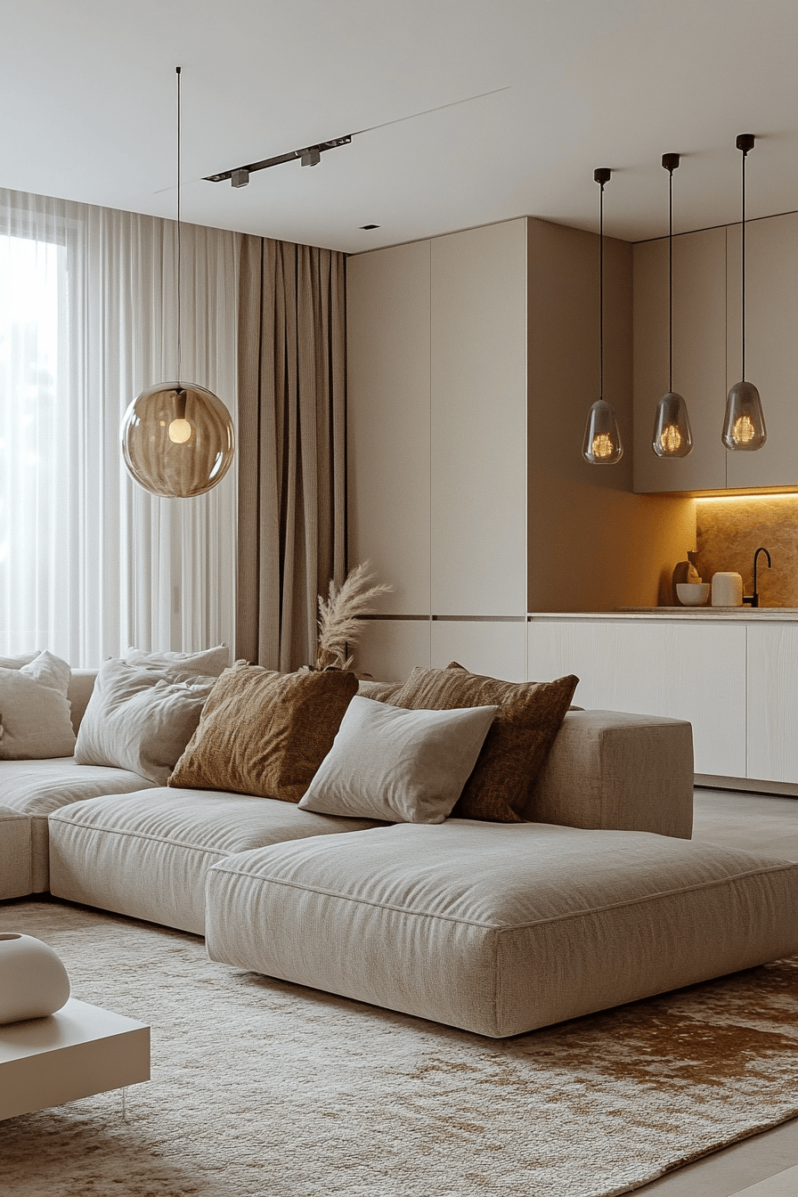 Tan tones soften bright white for a spacious yet cozy apartment aesthetic cozy setup that feels fresh and open. Low-profile furniture keeps the look grounded while warm lighting adds intimacy. Incorporate woven elements for added character. Perfect for open-plan homes craving comfort.