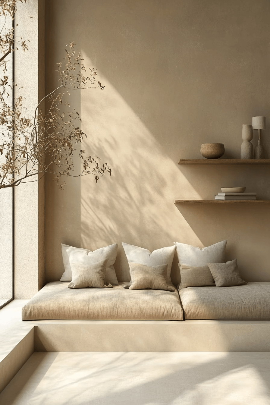 Soft beige tones meet minimalist design for the perfect apartment aesthetic cozy corner. Smooth textures and a clutter-free setup create a calming backdrop. A low-profile sofa, warm lighting, and neutral cushions enhance comfort without breaking the simplicity. Perfect for small studios or reading nooks.