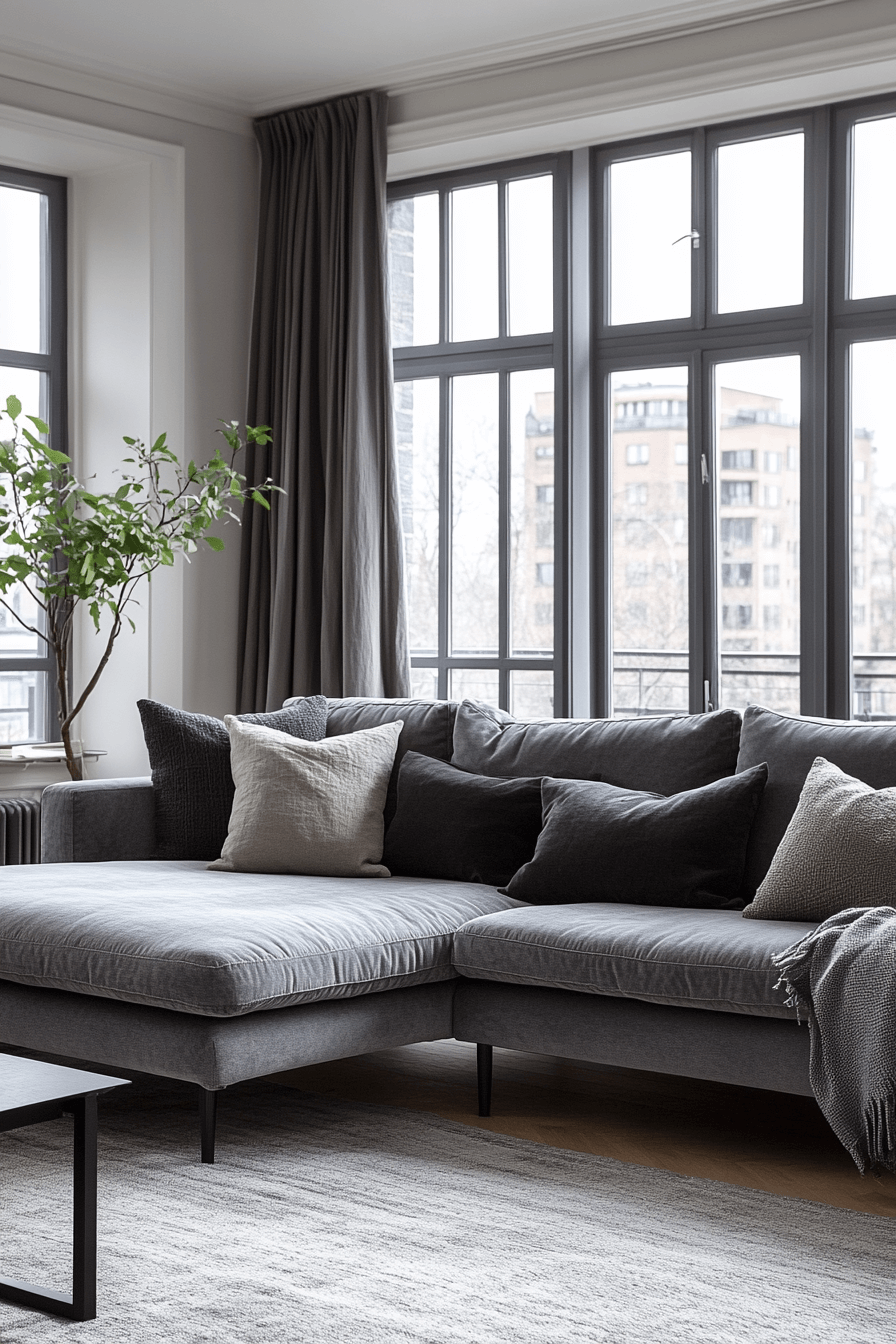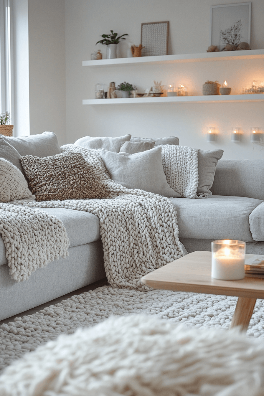 Light, medium, and dark grays bring depth to a sleek apartment aesthetic cozy design. Chunky knit throws and layered lighting keep it warm and inviting. This monochrome style is tranquil, modern, and endlessly chic. Perfect for those who love a polished vibe.