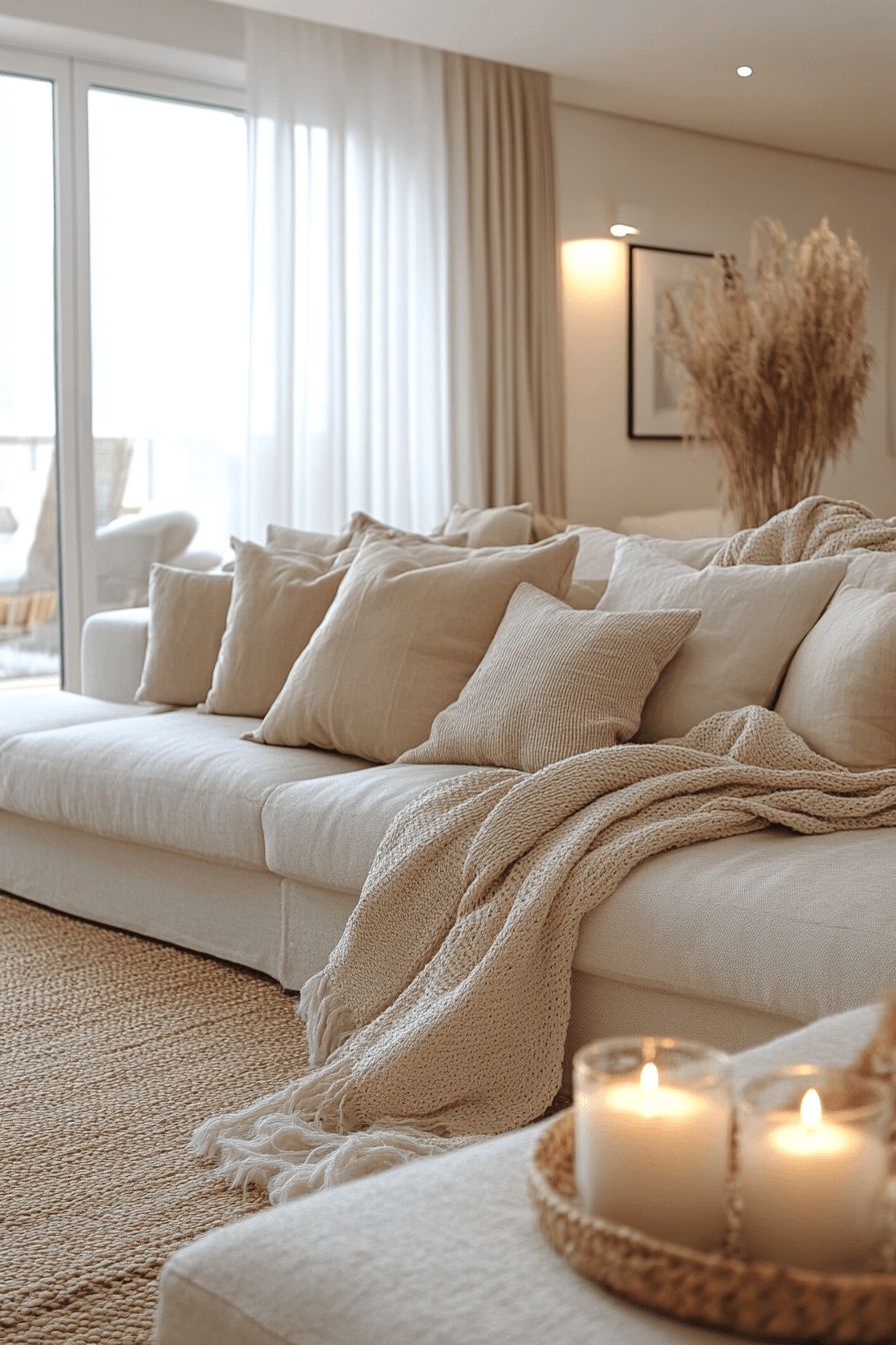 Multiple shades of white turn small spaces into bright apartment aesthetic cozy havens that feel open yet comforting. Plush fabrics and layered lighting add warmth, ensuring the look is inviting rather than stark. Mix in subtle metallics or glass accents for a modern touch. Minimal yet deeply comfortable for everyday living.