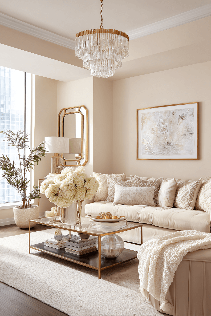 A serene beige apartment shows how monochromatic tones can deliver powerful apartment inspiration. Layering multiple shades of beige keeps the look dynamic and textured rather than one-dimensional. Soft fabrics, clean silhouettes, and subtle metallic accents add just enough interest. This approach makes smaller apartments feel expansive and airy. The consistency in tone helps everything flow seamlessly from room to room. Click to bring this calming beige into your own space.
