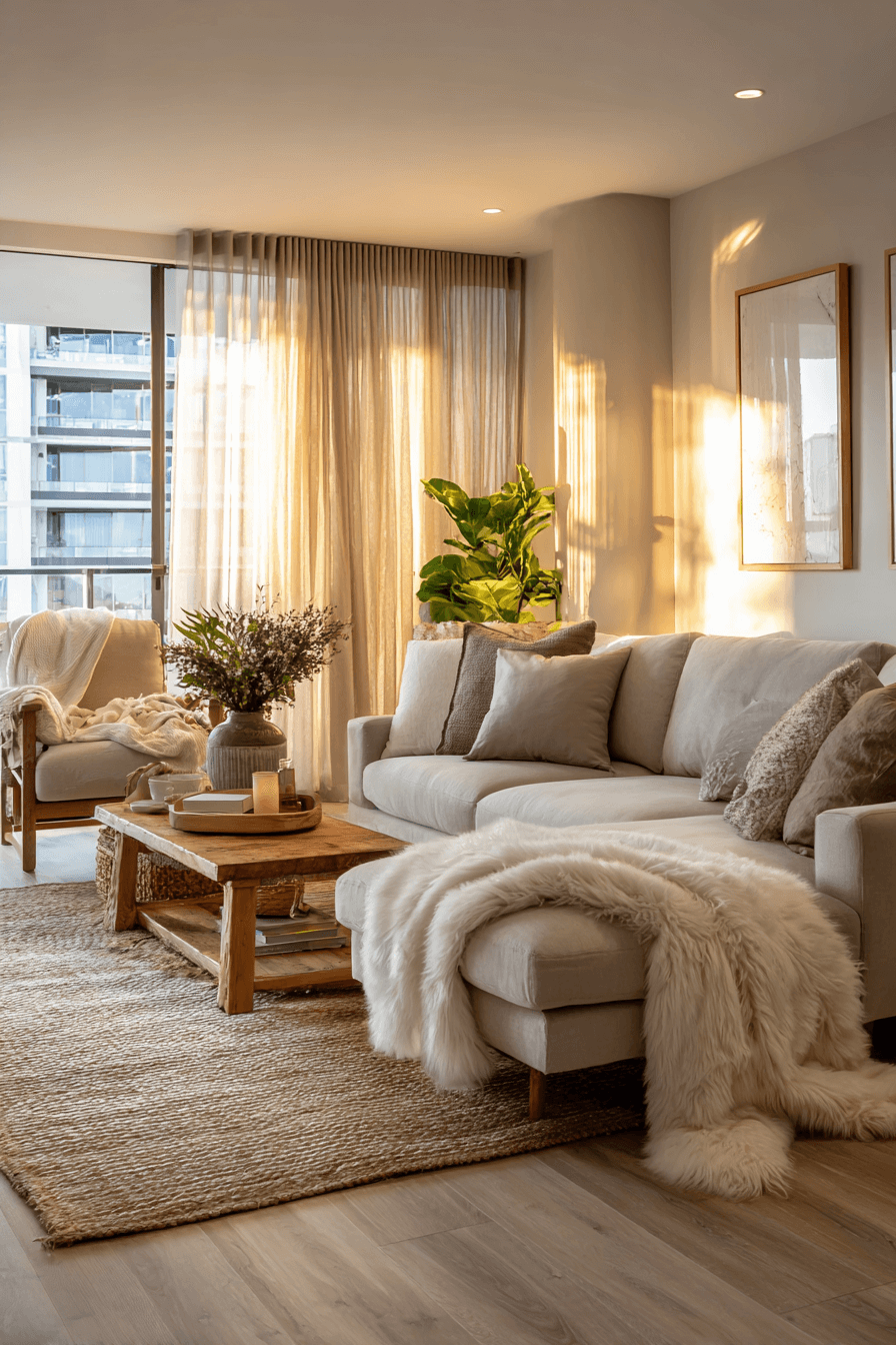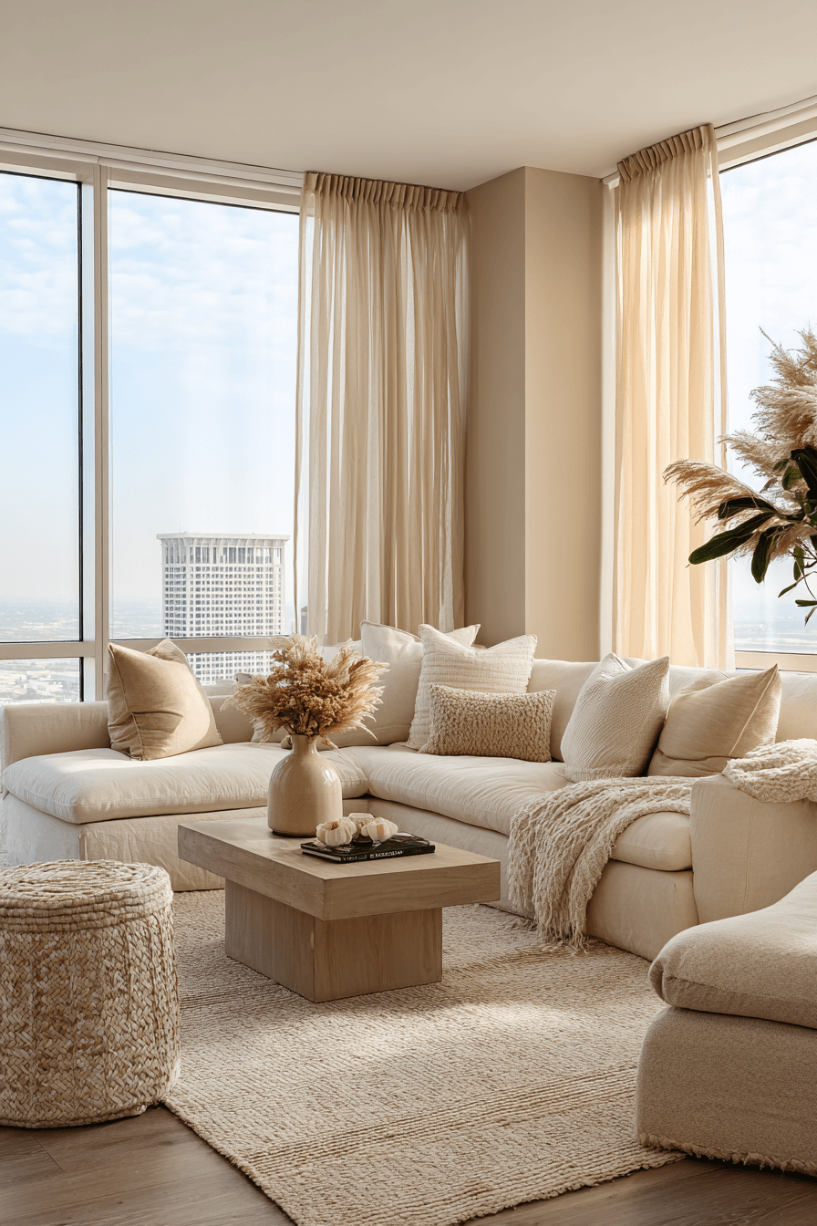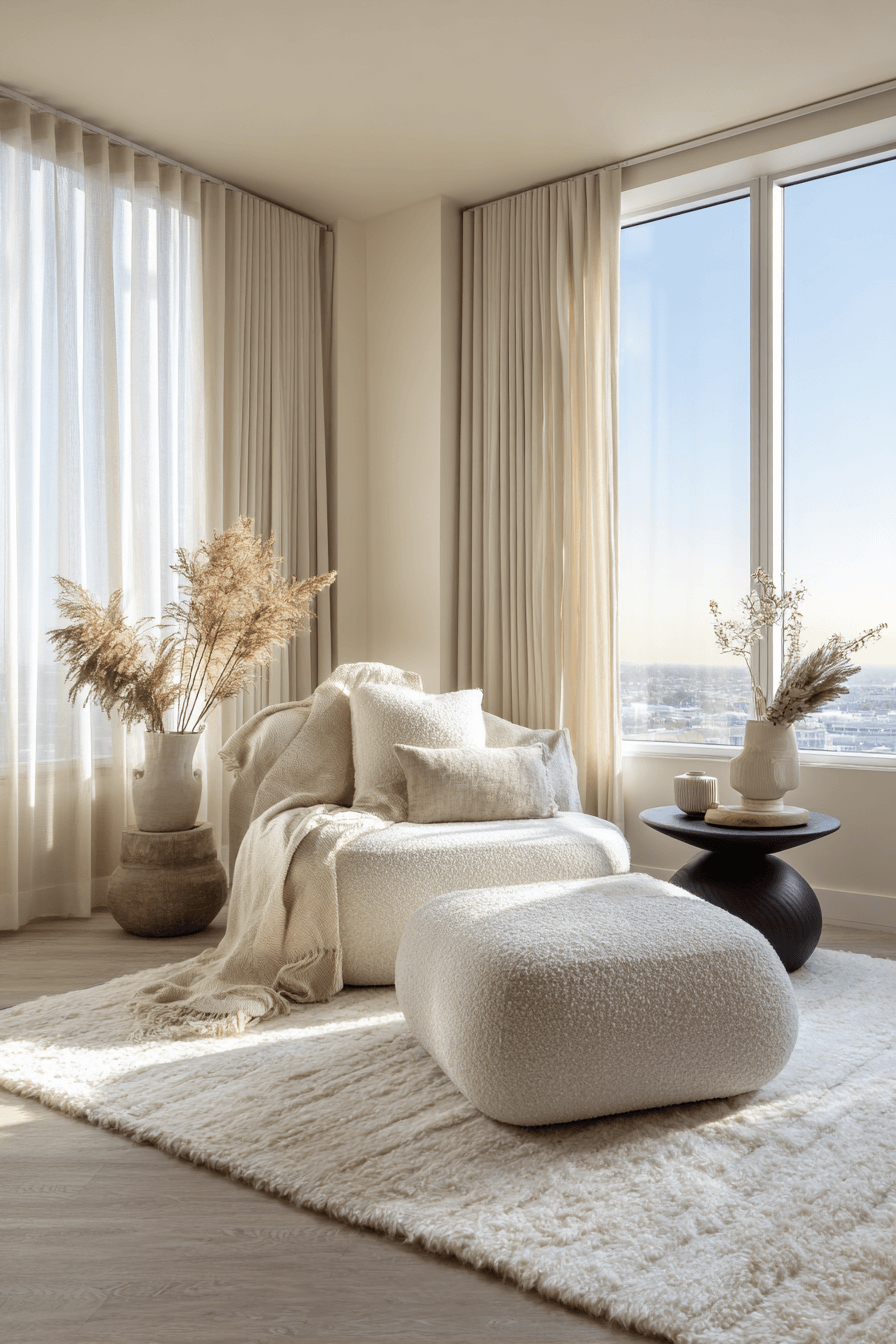 A textured neutral haven shows how depth can elevate apartment inspiration without loud color. Mixing fabrics like boucle, linen, and soft knits adds richness to a simple palette. The result feels layered and luxurious while still staying understated. This style works especially well in apartments where a calm, cohesive look makes the space feel larger. Subtle variations in tone keep the eye engaged. Tap to explore the power of texture in your home.