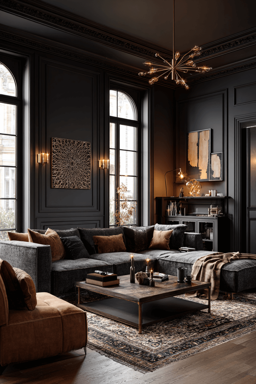Moody luxe apartment look embraces deeper tones for dramatic apartment inspiration. Rich hues paired with warm lighting create depth and sophistication. The contrast between dark walls and lighter furnishings keeps the design balanced. This approach works in apartments by adding personality without overwhelming the layout. Strategic styling keeps everything refined and organized. Tap to explore moody elegance in your home.