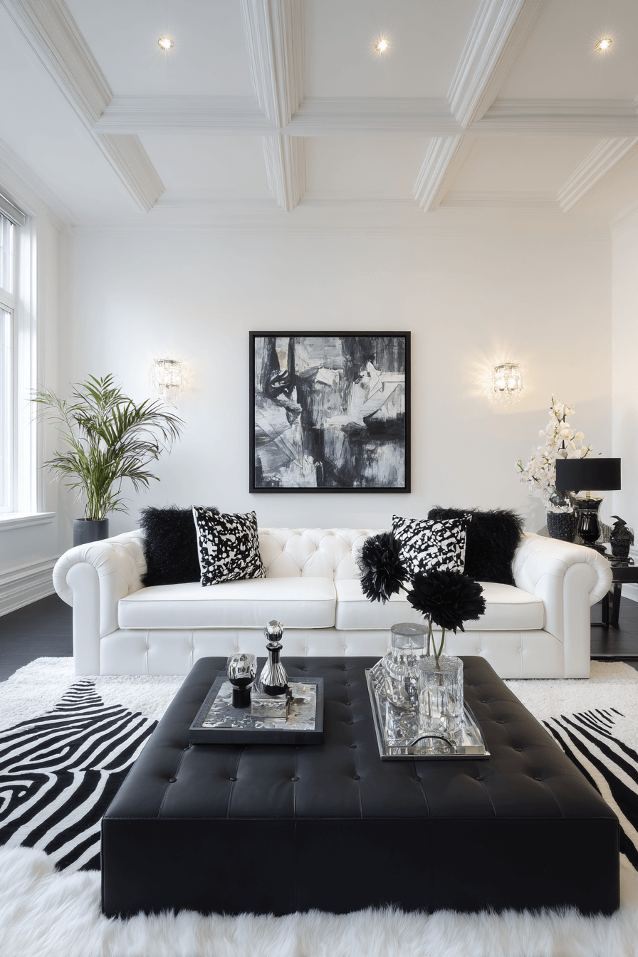 High-contrast black and white design delivers bold apartment inspiration with timeless appeal. The strong contrast adds definition and visual interest instantly. Crisp white walls paired with deep black accents keep the look sharp and modern. This palette works particularly well in compact apartments because it enhances architectural lines. Layered lighting and soft textures prevent the contrast from feeling harsh. Click to see how to style this classic combo beautifully.