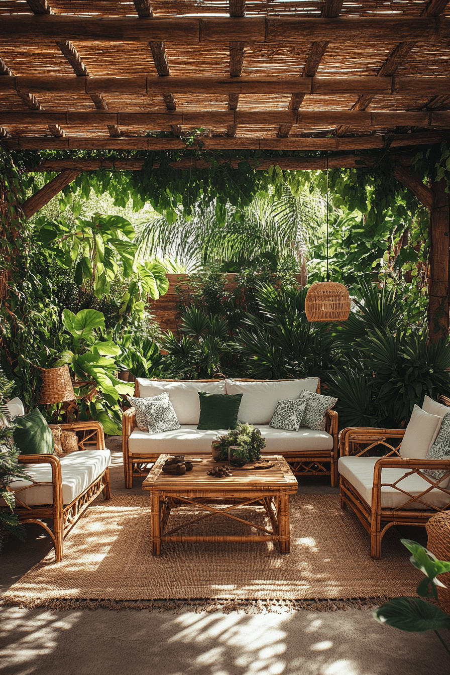 A tropical backyard hideaway energizes backyard decor with lush textures, warm tones, and vibrant elements that evoke a vacation-like atmosphere. Natural wood furniture, breezy fabrics, and layered greenery create a fresh and lively environment. Woven accents, bamboo details, and soft cushions add depth and character. Bright pops of color or patterned textiles bring personality without overwhelming the design. The space feels open, relaxed, and full of life. Soft seating areas invite you to unwind and enjoy the surroundings. It’s the perfect way to create a private escape at home. Discover this tropical vibe now!