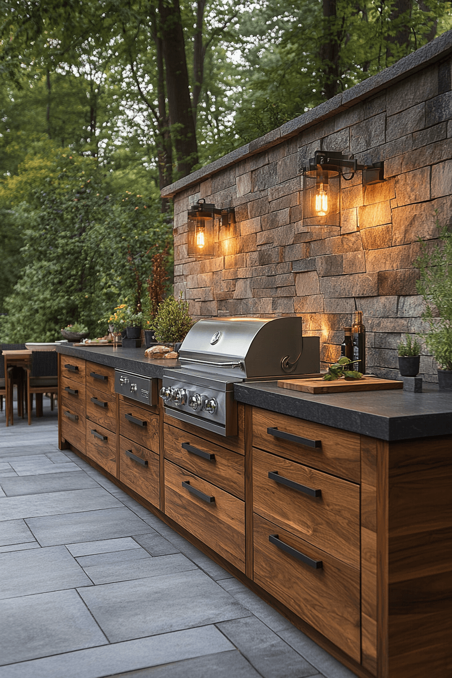 An outdoor kitchen corner upgrades backyard decor with a functional and stylish cooking space designed for both convenience and entertaining. Sleek countertops, modern appliances, and weather-resistant materials create a polished and durable setup. Clean lines and organized layouts ensure efficiency while maintaining a modern look. Integrated storage keeps essentials tucked away, preserving a clutter-free appearance. Lighting above the cooking area enhances both visibility and ambiance. The space blends seamlessly with surrounding seating or dining areas. It’s perfect for hosting gatherings or enjoying everyday outdoor meals. Click to discover outdoor kitchen ideas!