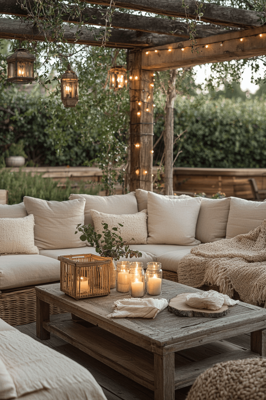 A cozy outdoor lounge brings backyard decor to life with oversized cushions, warm textures, and soft lighting that instantly relaxes the mood. Deep seating arrangements, woven furniture, and layered throws create a welcoming, sink-in feel that invites long conversations. Neutral tones paired with soft earthy hues keep the palette calming and cohesive. String lights, lanterns, or candles cast a gentle glow that transforms the space at night. Small accent tables and decor pieces add function without crowding the layout. The atmosphere feels intimate, stylish, and perfect for everyday comfort. Click to explore more cozy ideas!