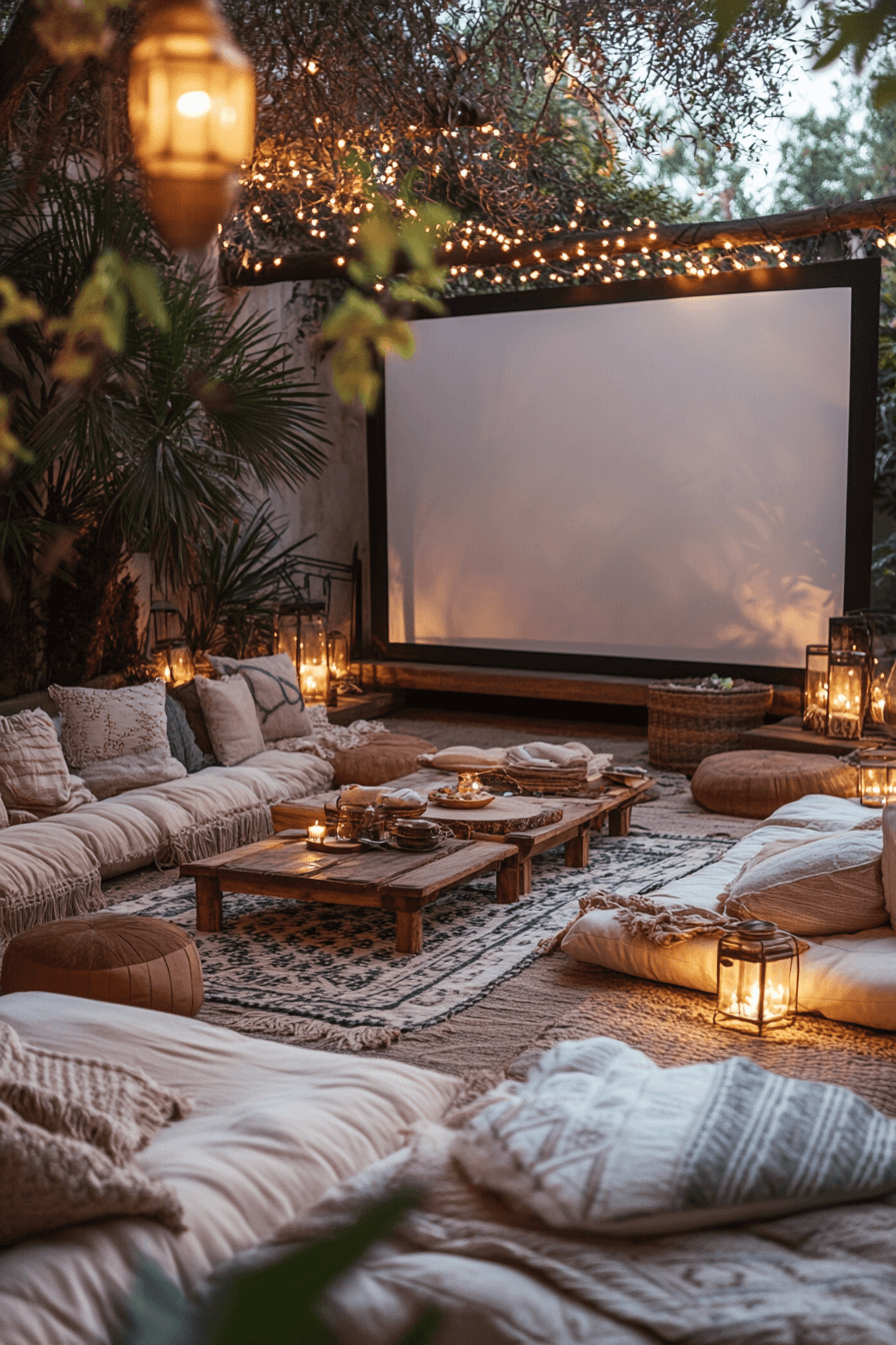 A backyard movie setup transforms backyard decor into an entertainment-ready space that feels both cozy and memorable. Soft seating like outdoor sofas, bean bags, or layered floor cushions creates a relaxed viewing area that invites everyone to settle in. A simple projection screen or blank wall becomes the focal point, framed by warm string lights or lanterns for ambiance. Blankets and plush throws add comfort while enhancing the cozy vibe. Subtle lighting ensures visibility without distracting from the screen. Small side tables for snacks and drinks complete the setup. The space feels fun, inviting, and perfect for casual nights under the stars. Click to explore this setup!