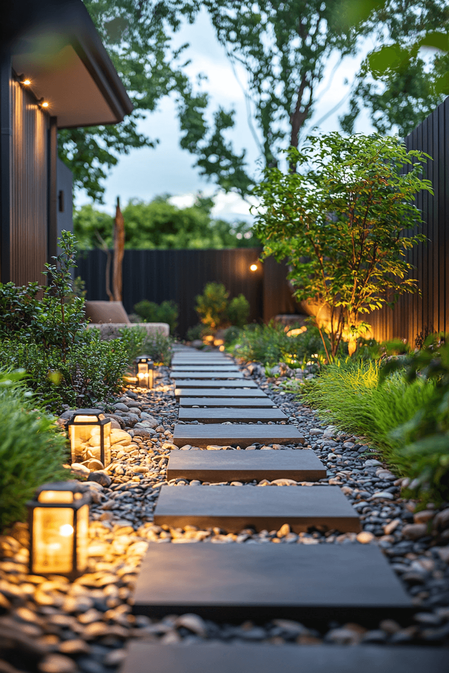 A modern garden pathway enhances backyard decor with clean lines and structured flow that naturally guide movement through the space. Materials like stone pavers, concrete slabs, or wooden planks create a defined path that feels intentional and stylish. The spacing and layout can add rhythm, making the design visually engaging. Surrounding greenery or gravel borders soften the edges and add contrast. Subtle lighting, such as ground lights or path lanterns, highlights the walkway beautifully at night. The pathway connects different areas while adding depth and dimension. The result is both functional and visually refined. Discover pathway ideas here!