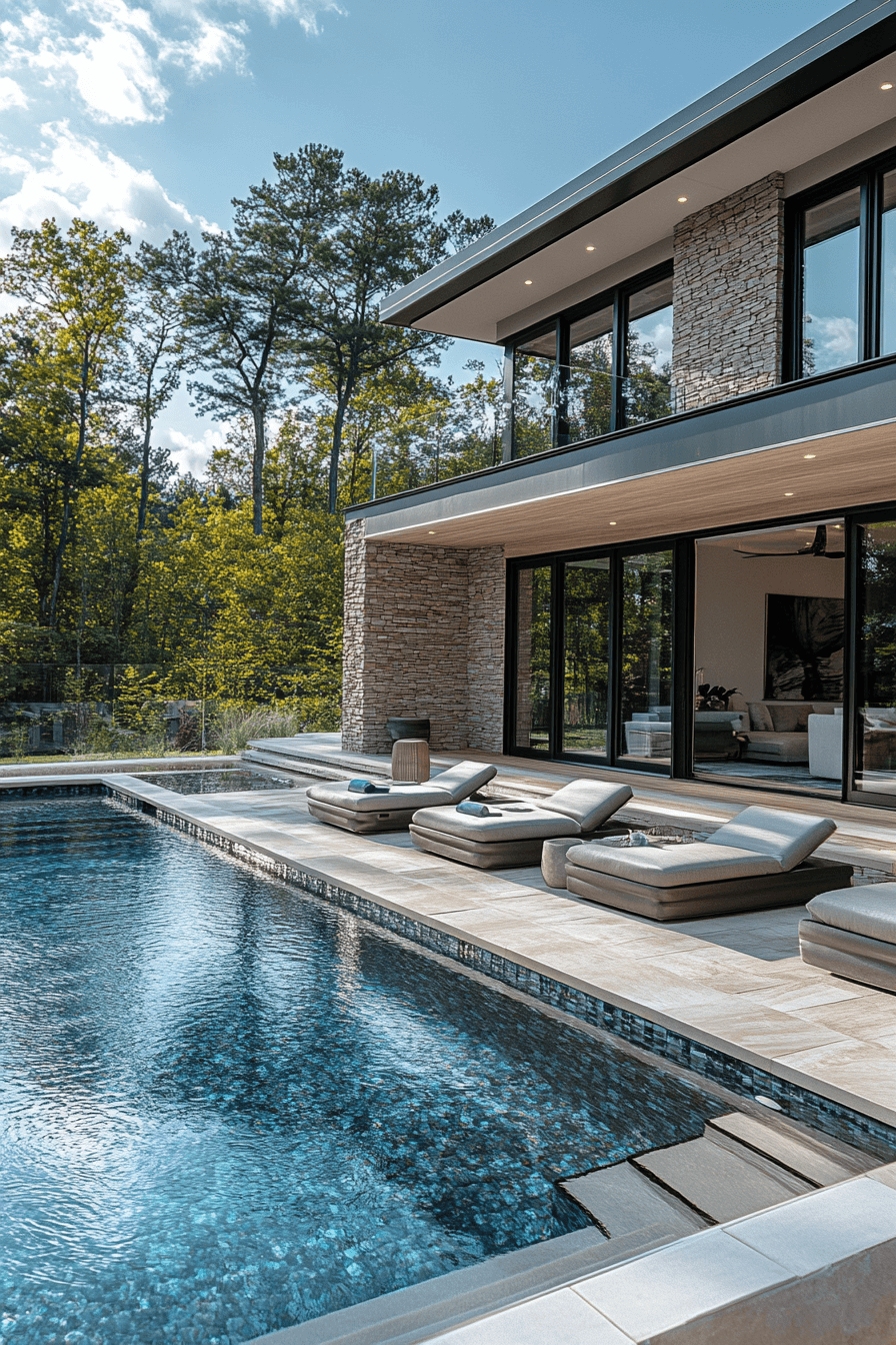 Luxury poolside vibes bring upscale energy to backyard decor with sleek loungers, crisp lines, and refined materials that feel resort-inspired. Smooth stone decking, glass accents, and light-toned wood create a polished and cohesive foundation. Plush cushions and minimal decor keep the focus on relaxation and comfort. The shimmering water reflects light, adding movement and brightness to the entire space. Subtle landscaping enhances the clean, modern aesthetic. The layout feels open, airy, and indulgent. It’s like having a private luxury retreat right at home. Discover more poolside inspiration here!