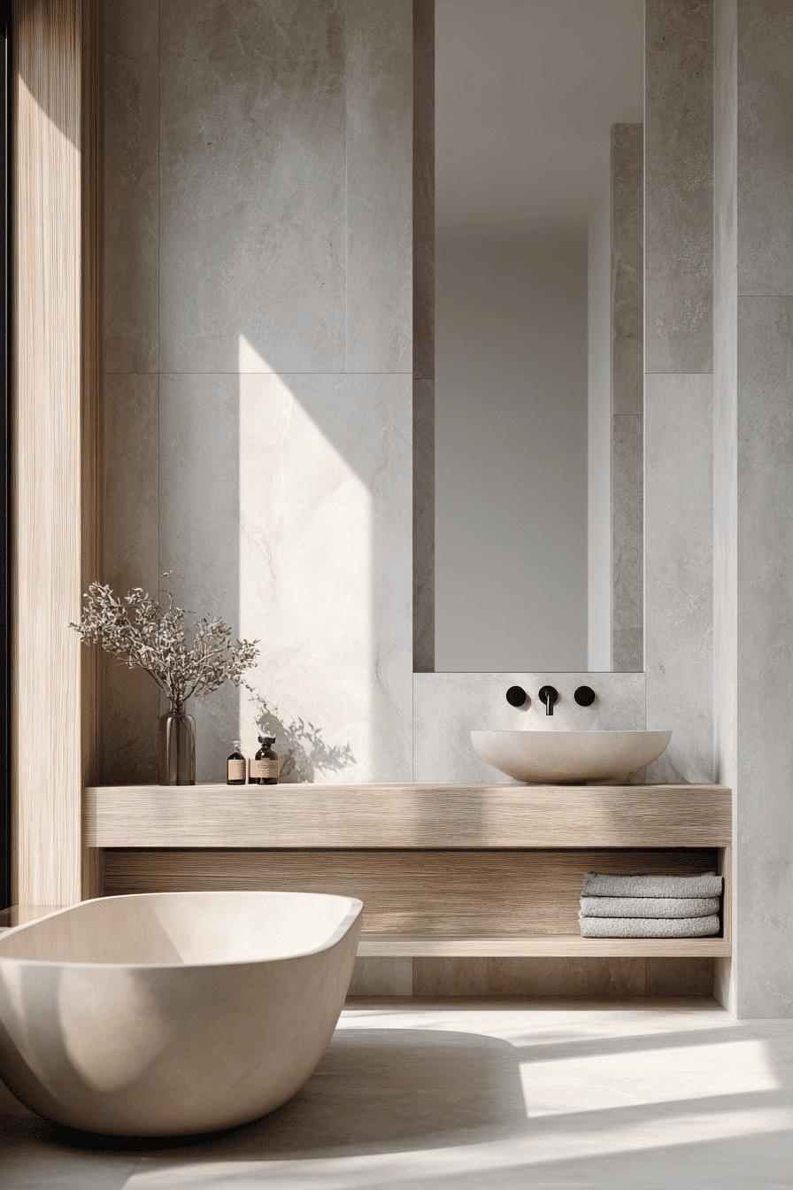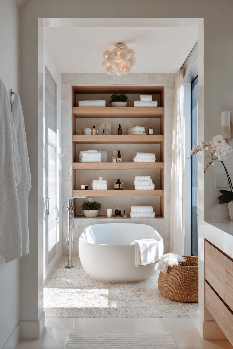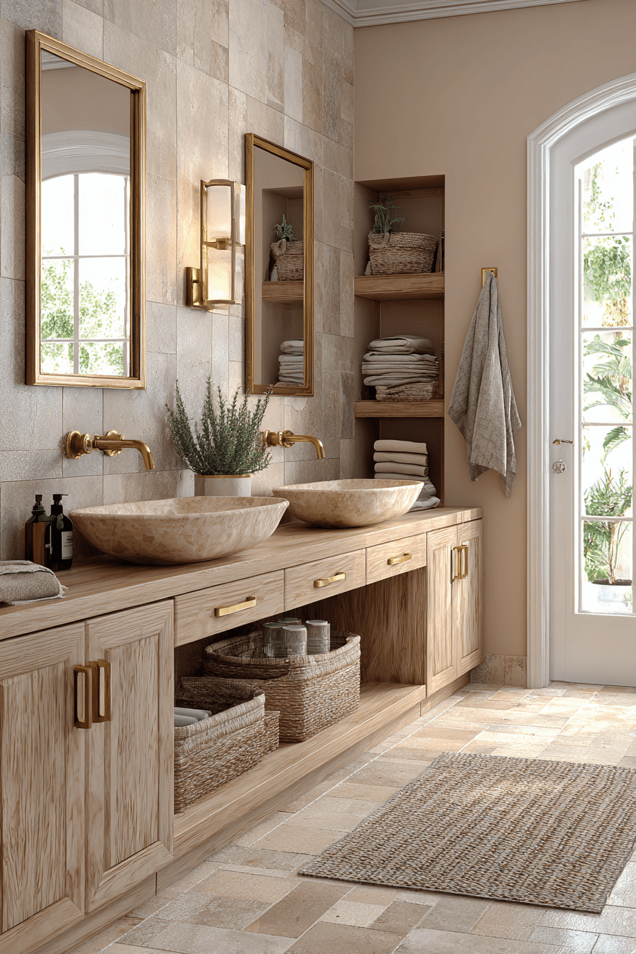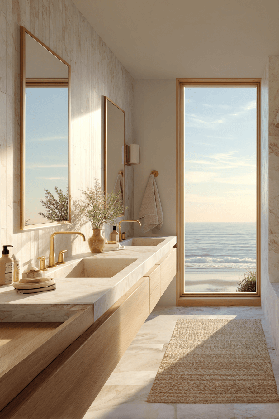 A light and airy beach bath focuses on open space, minimal décor, and soft neutral tones. This beach house bathroom approach works because it prioritizes brightness and flow. Large mirrors bounce light around the room, making everything feel expansive. Pale woods and subtle textures add warmth without heaviness. The overall effect feels like a breath of fresh ocean air every time you walk in. Tap to bring this breezy concept to life.