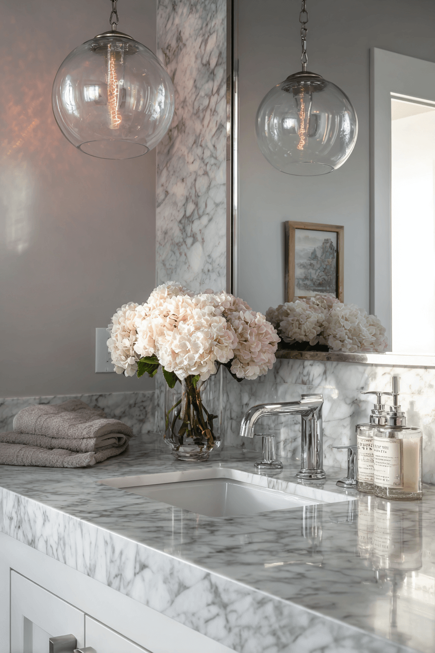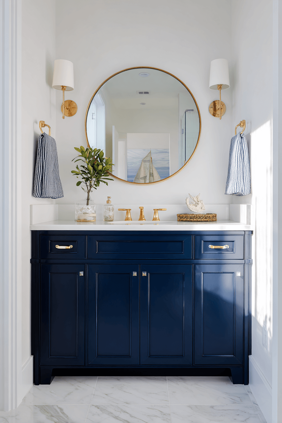 A coastal luxe powder room proves that even small spaces can feel grand. In a beach house bathroom, luxe finishes like marble counters and statement lighting elevate the design. The coastal touch comes through in soft color palettes and natural textures rather than heavy décor. This approach keeps the space modern and sophisticated. It’s refined, polished, and still effortlessly beachy. Click to elevate your powder room with coastal glam.