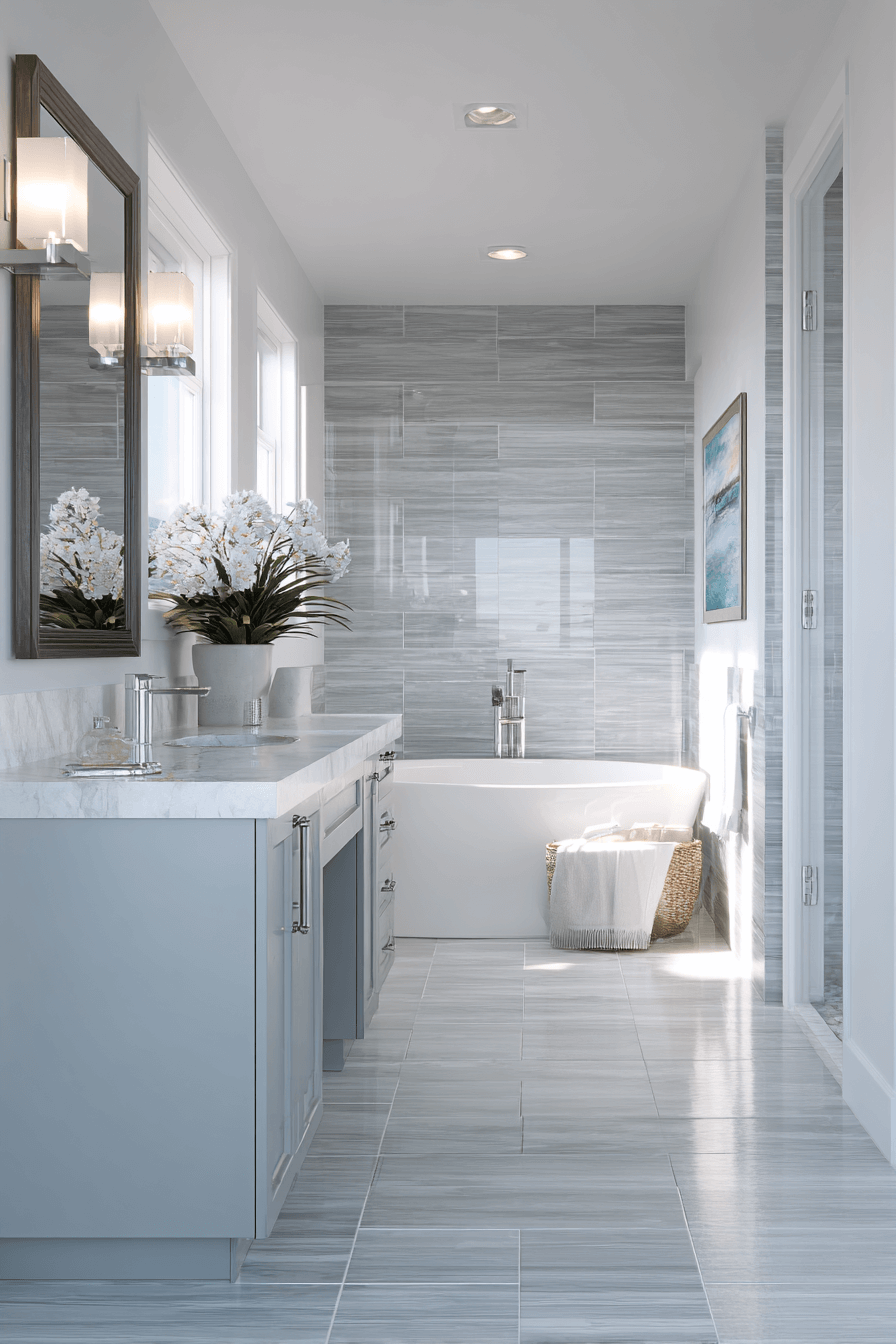 Saltwater harmony focuses on soft blues, whites, and subtle gray undertones. In a beach house bathroom, these tones feel cohesive and naturally inspired. The cool palette pairs beautifully with sleek chrome or brushed nickel fixtures. This design works because it feels unified and calming. The simplicity keeps everything fresh and timeless. Tap to bring harmony into your coastal space.