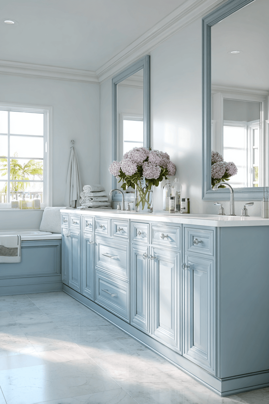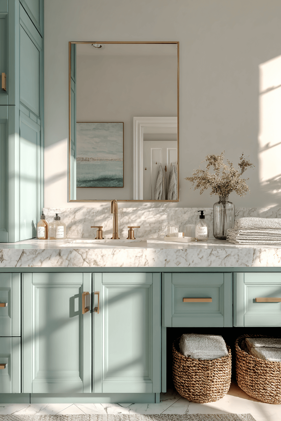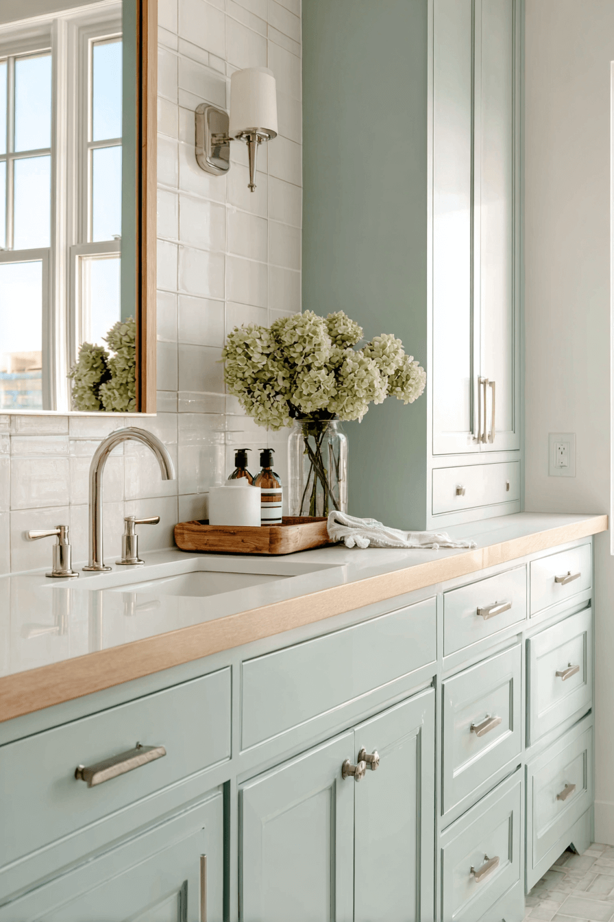 An ocean mist vanity space introduces pale gray-blue tones for a subtle coastal nod. In a beach house bathroom, this soft shade adds personality while keeping things refined. Paired with white countertops and sleek mirrors, the look feels polished. The cool undertones reflect natural light beautifully. It’s understated, elegant, and effortlessly beachy. Click to refresh your vanity with this ocean-inspired touch.