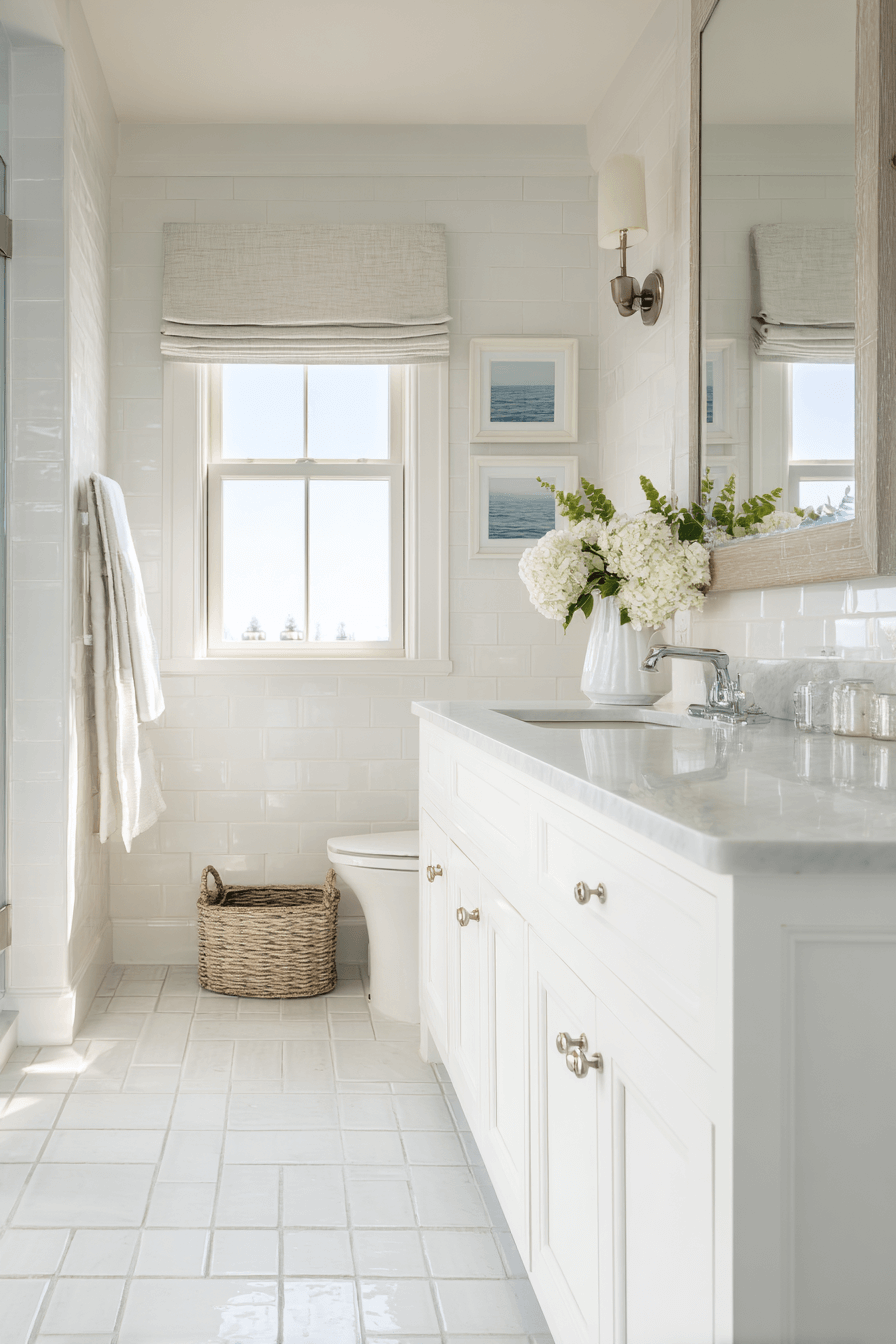 A breezy white beach bath creates a crisp, clean backdrop that instantly feels calming. This style thrives in a beach house bathroom because white amplifies natural light and pairs effortlessly with ocean views. Add brushed nickel fixtures and soft linen curtains for an airy, effortless finish. The simplicity keeps the room feeling uncluttered while still looking polished and high-end. A few coastal accents like subtle stripe patterns or driftwood frames complete the look without overpowering it. Tap to see how to recreate this bright coastal feel.