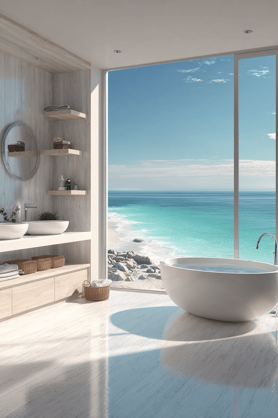 A bright oceanview bath centers around maximizing natural light and scenery. In a beach house bathroom, large windows and reflective surfaces amplify the coastal setting. Light finishes ensure the view remains the star of the space. The design works because it feels connected to the outdoors. Clean lines keep it modern and fresh. Tap to let your bathroom embrace the view.