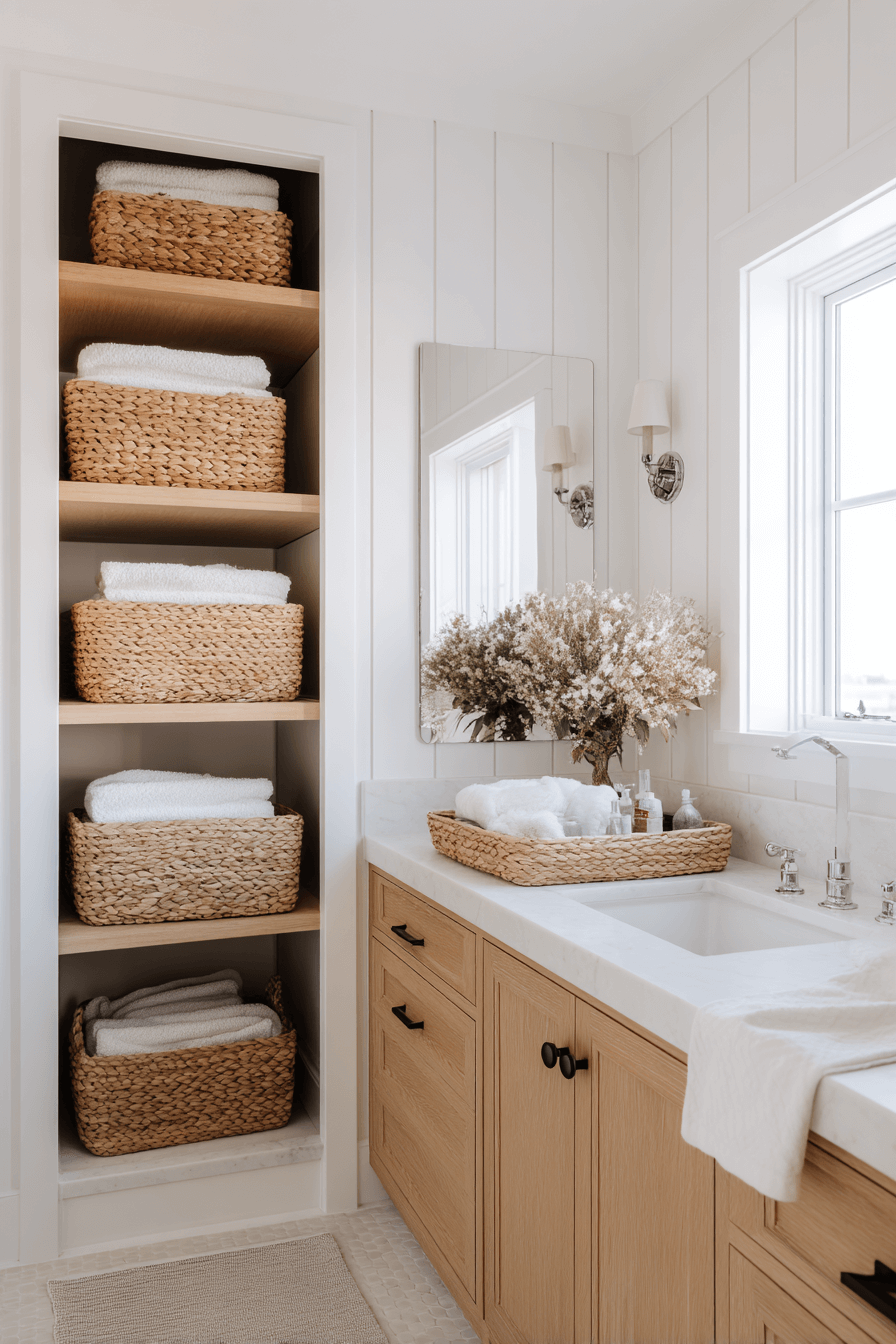 White and wicker create a bright yet textured combination. In a beach house bathroom, wicker baskets or light fixtures add warmth against crisp white walls. The contrast keeps the room feeling fresh and inviting. This design works because it’s simple but layered. The overall vibe is airy, natural, and welcoming. Tap to weave this coastal look into your space.
