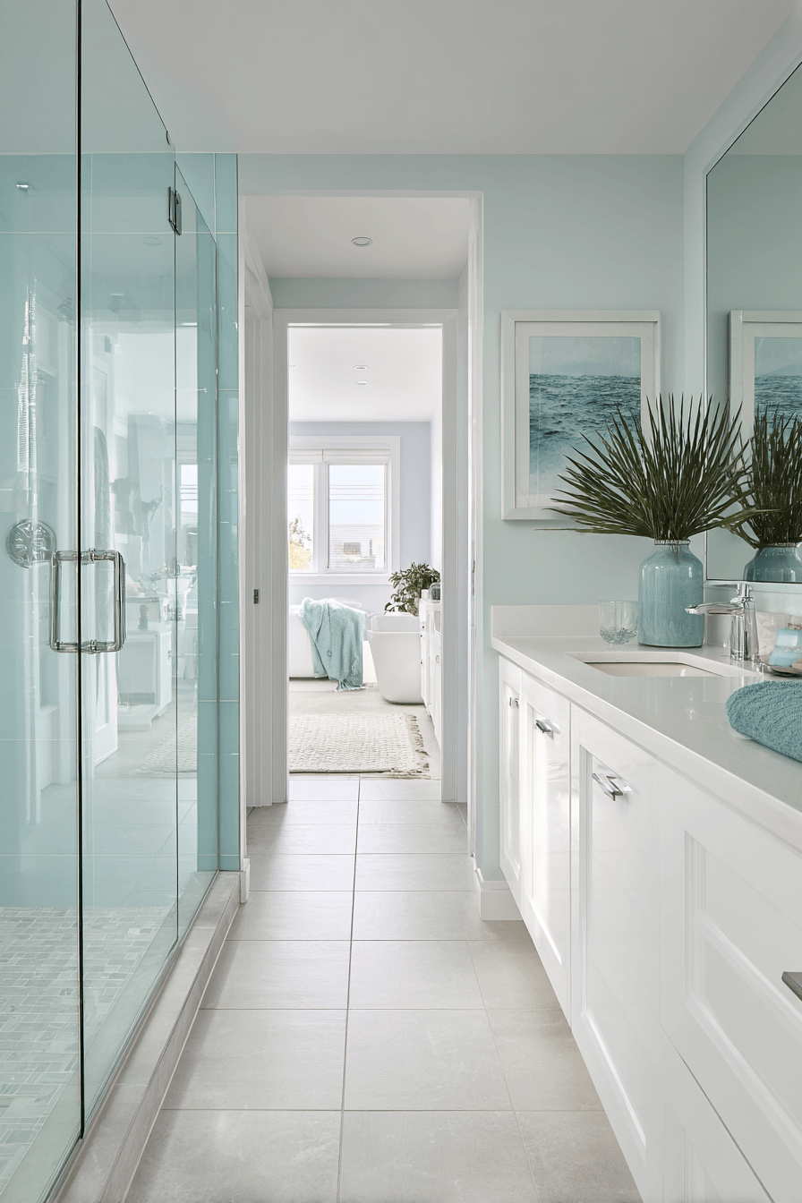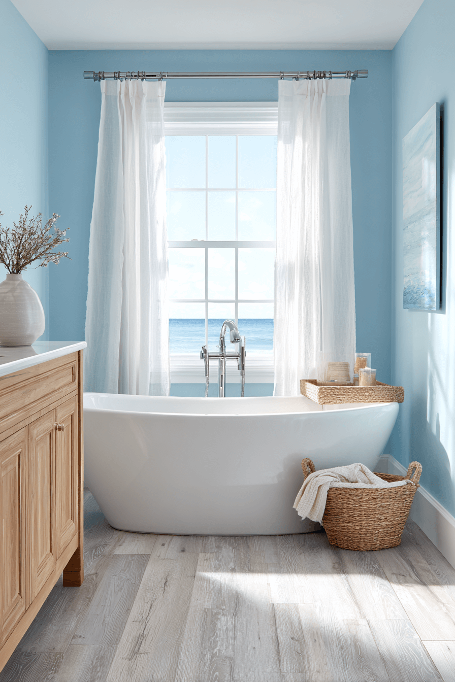 A calm tide retreat bath layers soft blues and sandy neutrals for a soothing effect. In a beach house bathroom, this combination mirrors gentle waves meeting the shore. The palette feels balanced, relaxed, and welcoming. Add textured tiles or shiplap walls for subtle interest. The overall look feels peaceful without being plain. Click to design your own tide-inspired retreat.