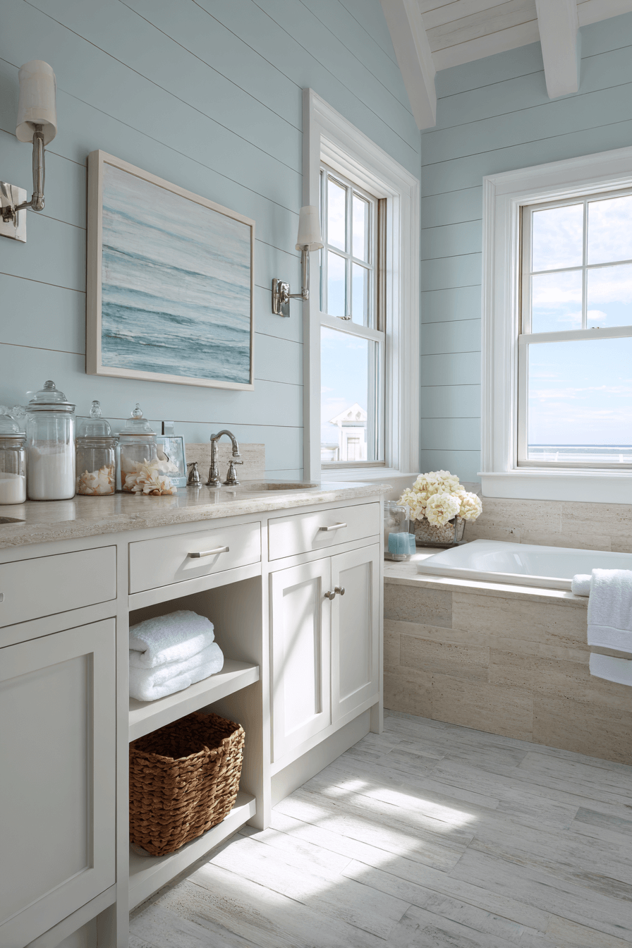 A soft blue shoreline bath introduces gentle ocean hues that instantly calm the senses. In a beach house bathroom, light blue walls or cabinetry create a soothing focal point without feeling too bold. The color reflects coastal skies and water, reinforcing that easy seaside mood. Paired with white tile and natural textures, it feels airy and welcoming. The softness keeps the design timeless rather than trendy. Tap to explore this serene coastal palette.