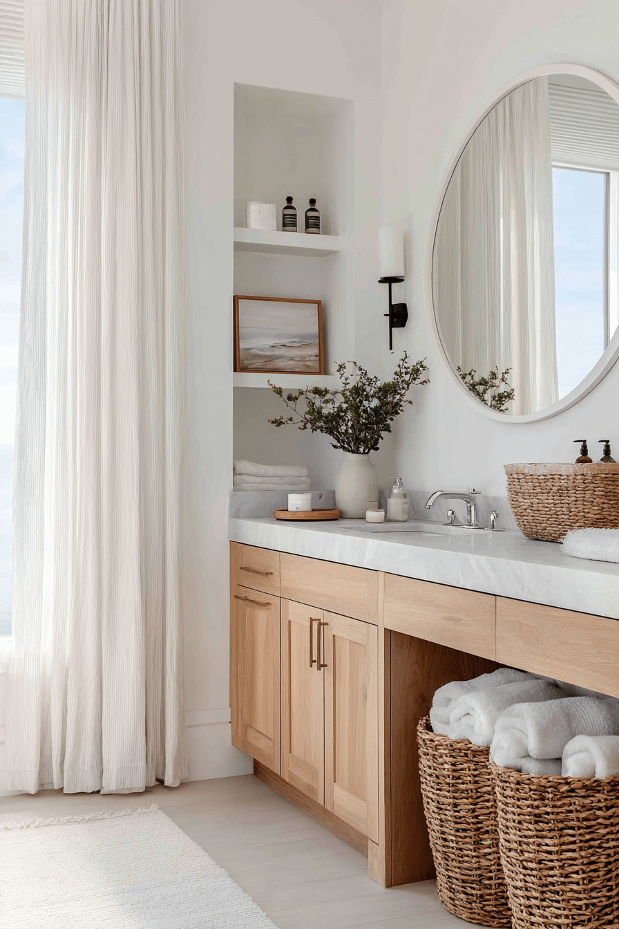 A light and airy beach bath focuses on open space, minimal décor, and soft neutral tones. This beach house bathroom approach works because it prioritizes brightness and flow. Large mirrors bounce light around the room, making everything feel expansive. Pale woods and subtle textures add warmth without heaviness. The overall effect feels like a breath of fresh ocean air every time you walk in. Tap to bring this breezy concept to life.