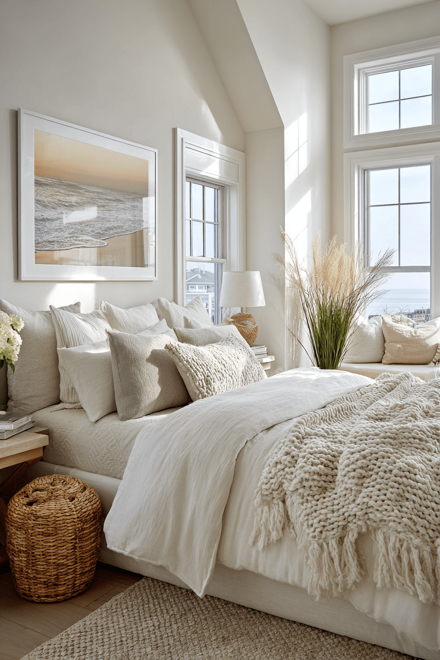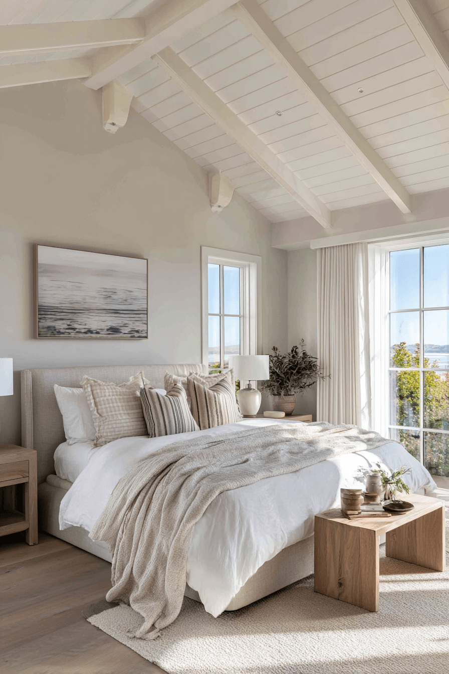 This serene design embraces simplicity, making it a perfect example of a modern beach house bedroom that feels both refined and welcoming. A neutral palette of whites, creams, and soft beiges is elevated with layered textures like cotton bedding, linen upholstery, and plush area rugs. Minimal decor inspired by the shoreline—such as subtle shells, soft-toned artwork, or natural wood pieces—adds personality without overwhelming the space. Clean lines and uncluttered surfaces keep the room feeling spacious and calm. Sunlight enhances every detail, casting a warm glow that softens the entire environment. The overall vibe feels tranquil, polished, and perfectly balanced between comfort and style. Explore how to bring this calm coastal look home!