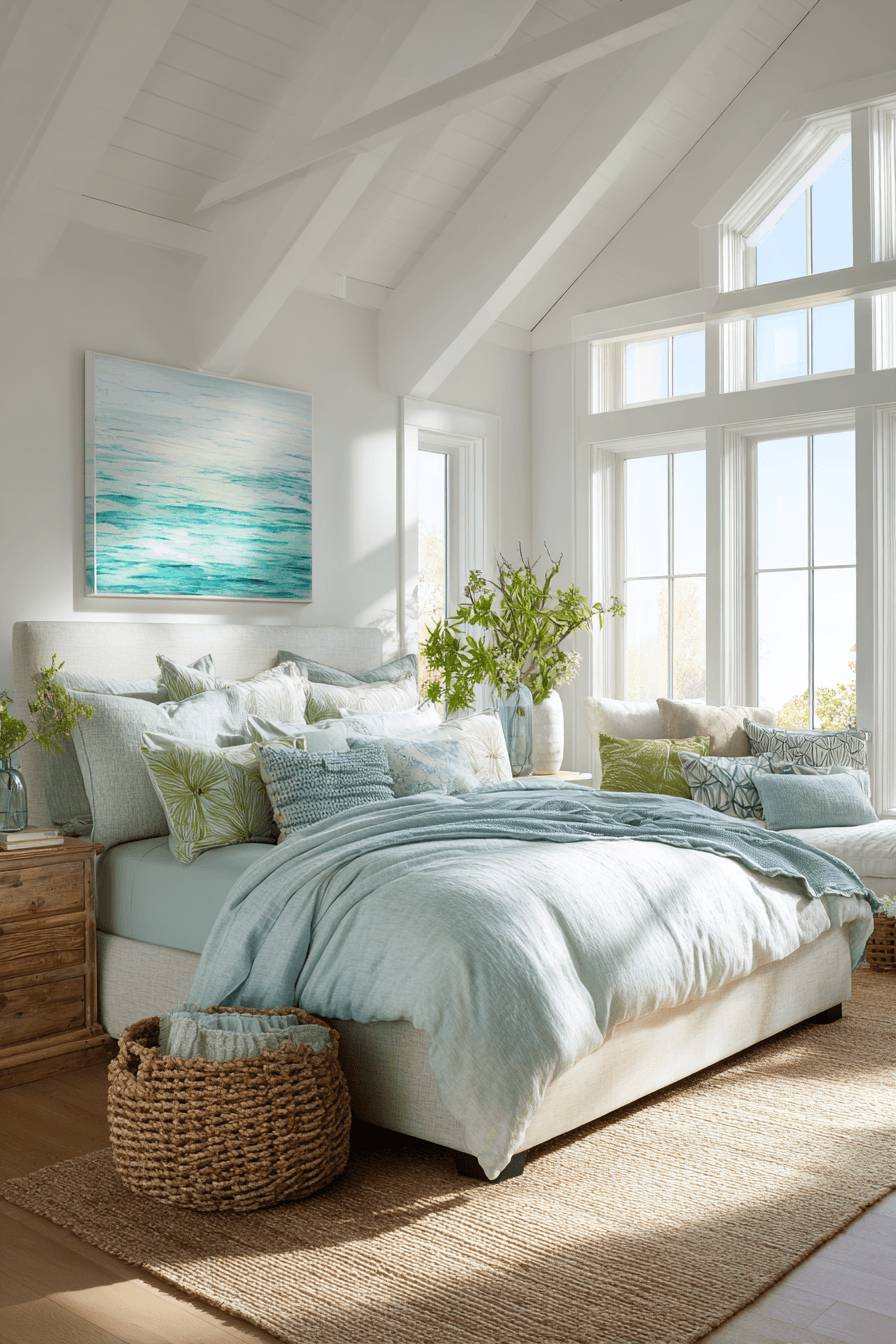 Soft seaglass tones create a tranquil and inviting beach house bedroom that feels effortlessly serene and beautifully balanced. Gentle greens and soft blues melt into crisp white backdrops, forming a clean and cohesive palette. Natural materials like light wood furniture, woven baskets, and textured rugs add warmth and visual depth. Layered textiles such as linen bedding and soft throws enhance the comfort and softness of the space. Thoughtful decor like translucent glass accents and subtle coastal art ties the look together. Light filters in beautifully, reflecting off the tones and amplifying the peaceful, airy atmosphere. Discover this serene seaglass-inspired space!