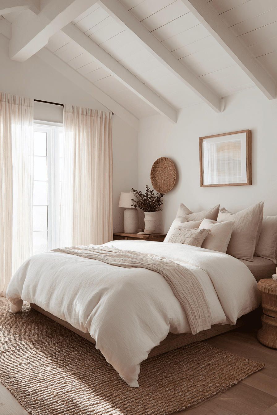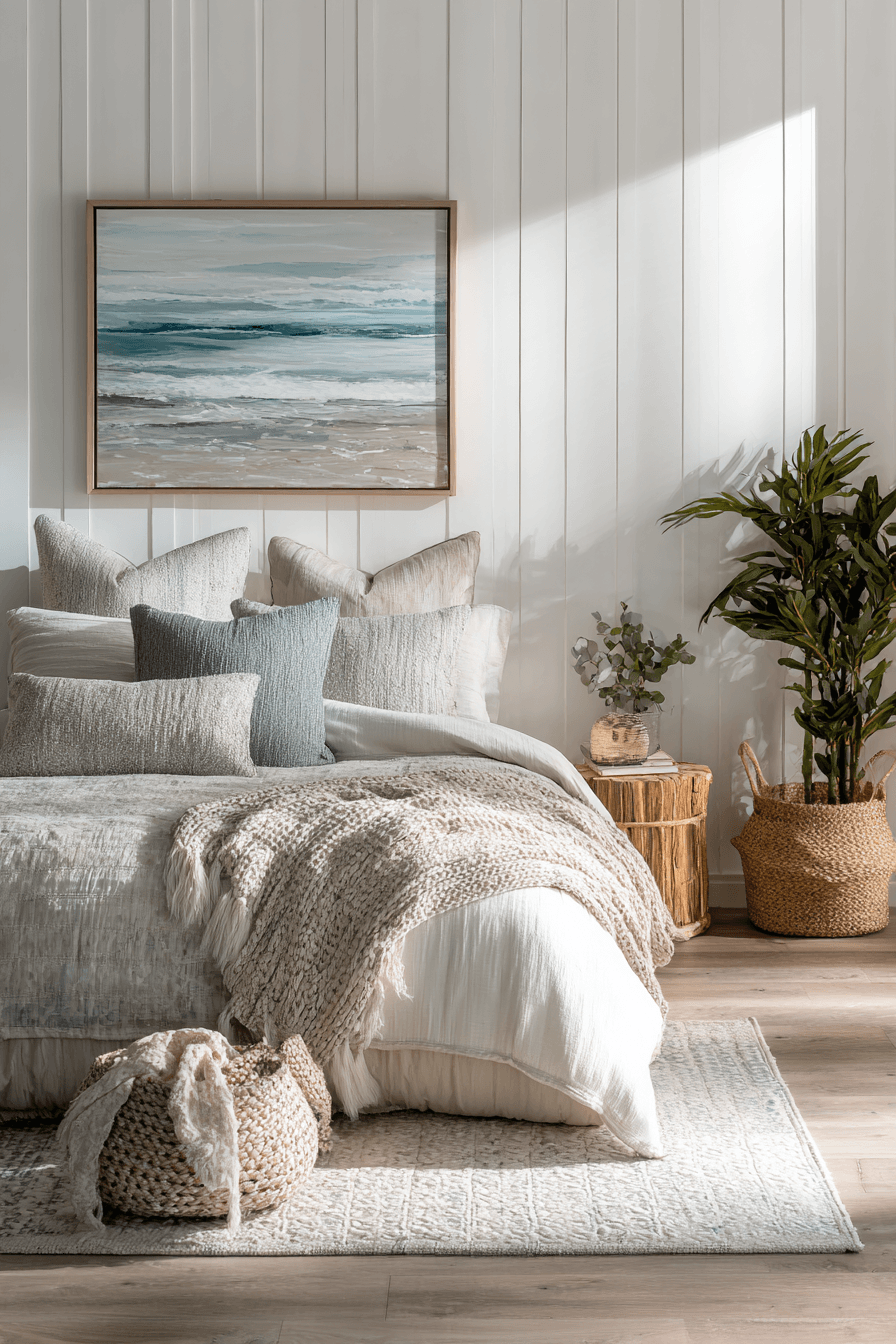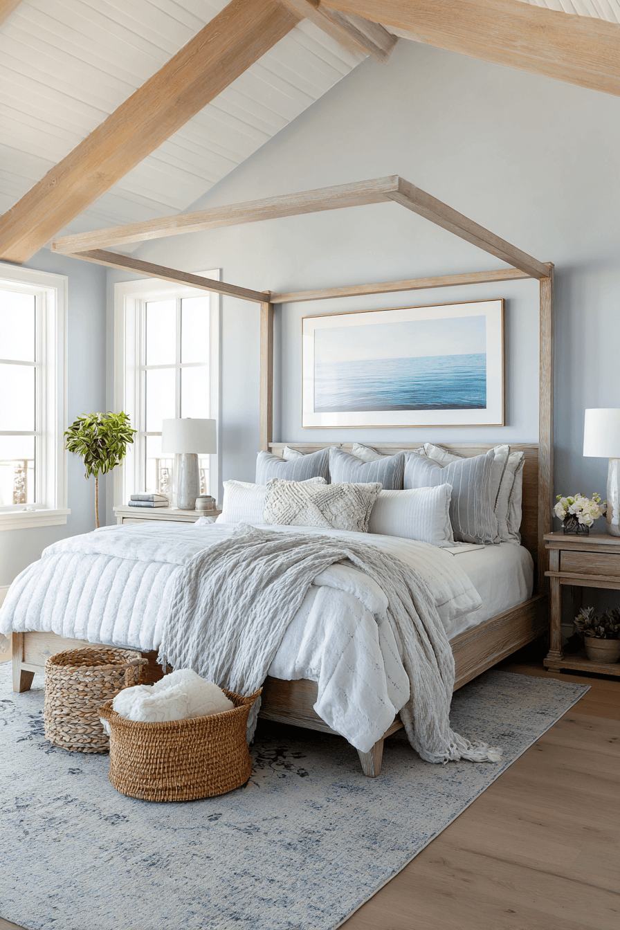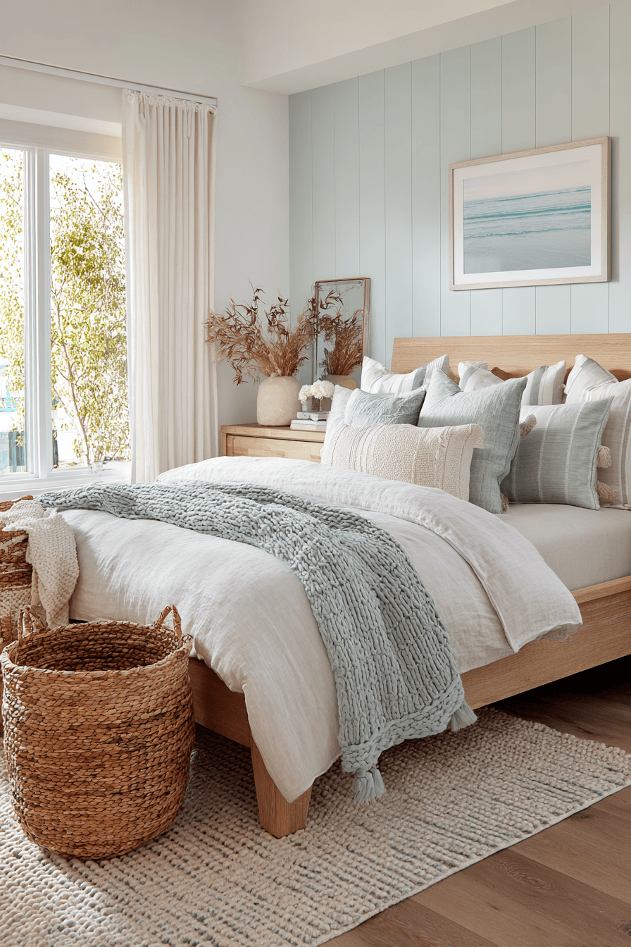 Soft coastal tones and airy textures define this dreamy take on a beach house bedroom, creating a space that feels instantly calming and inviting from the moment you walk in. Light wood furniture pairs beautifully with crisp white linens, while layered bedding and soft throws add a sense of comfort and quiet luxury. Subtle blue accents in pillows, artwork, and decor echo the ocean without overpowering the palette. Sheer curtains gently filter sunlight, allowing natural light to flow freely and brighten every corner of the room. Woven details like baskets, rugs, or a textured bench bring warmth and dimension to the airy design. The overall mood feels peaceful, breezy, and effortlessly stylish, like a serene escape by the sea. Click to discover this calming coastal retreat!