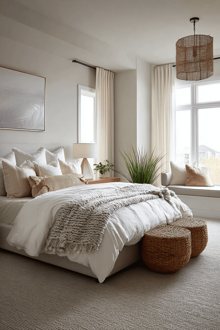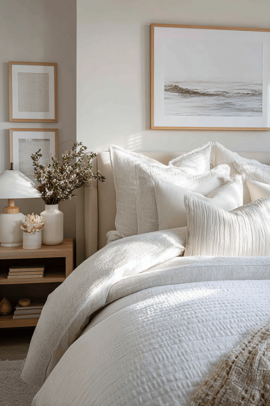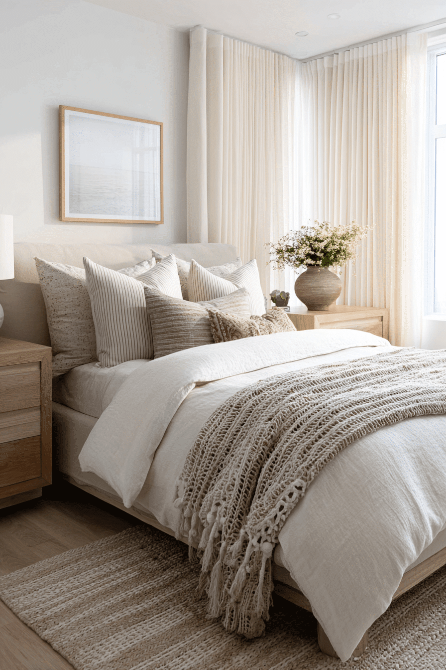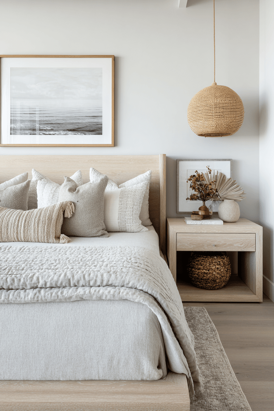 Soft coastal tones and airy textures define this dreamy take on a beach house bedroom, creating a space that feels instantly calming and inviting from the moment you walk in. Light wood furniture pairs beautifully with crisp white linens, while layered bedding and soft throws add a sense of comfort and quiet luxury. Subtle blue accents in pillows, artwork, and decor echo the ocean without overpowering the palette. Sheer curtains gently filter sunlight, allowing natural light to flow freely and brighten every corner of the room. Woven details like baskets, rugs, or a textured bench bring warmth and dimension to the airy design. The overall mood feels peaceful, breezy, and effortlessly stylish, like a serene escape by the sea. Click to discover this calming coastal retreat!