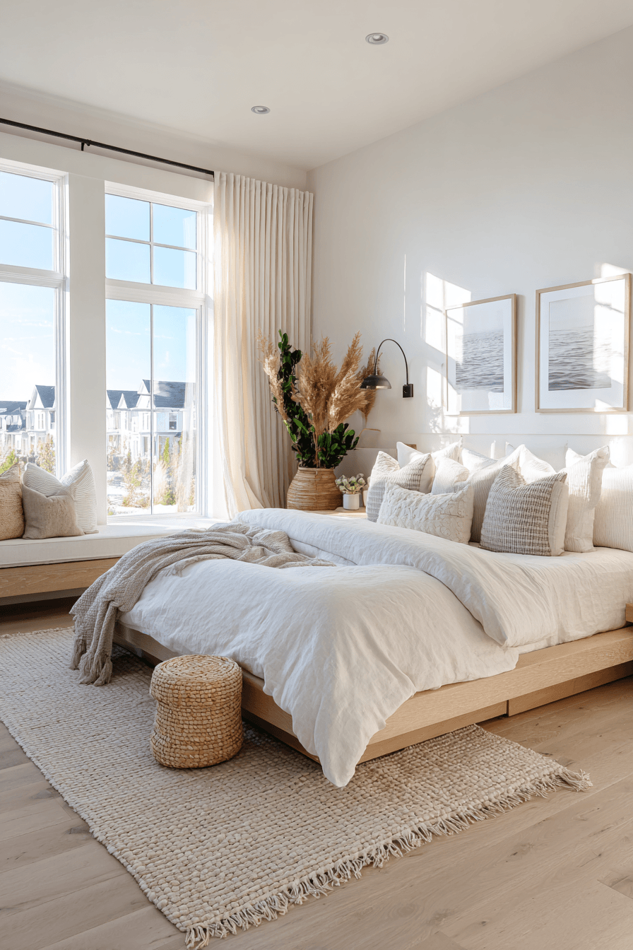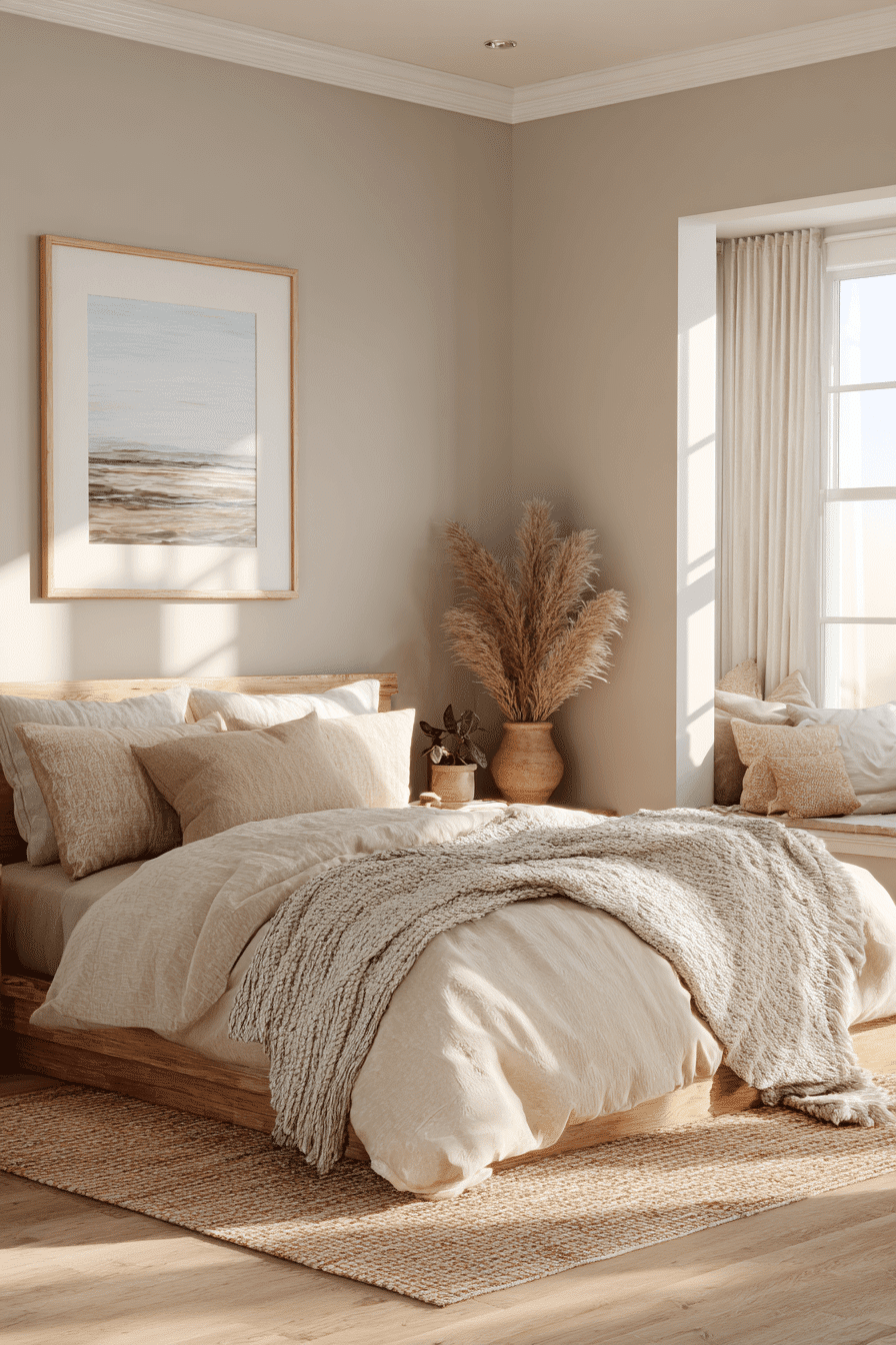 This design captures the quiet beauty of coastal dunes, making it a perfect beach house bedroom for a relaxed and restorative lifestyle. Sandy beiges, warm taupes, and soft ivory tones create a grounded and soothing palette. Soft textures like cotton bedding, woven rugs, and light throws add comfort while maintaining a minimalist aesthetic. Minimal decor keeps the space open and uncluttered, allowing the natural tones to take center stage. Light wood furniture and organic elements reinforce the connection to nature. Natural light highlights every subtle detail, adding warmth and softness throughout the room. Tap to explore this dune-inspired bedroom!