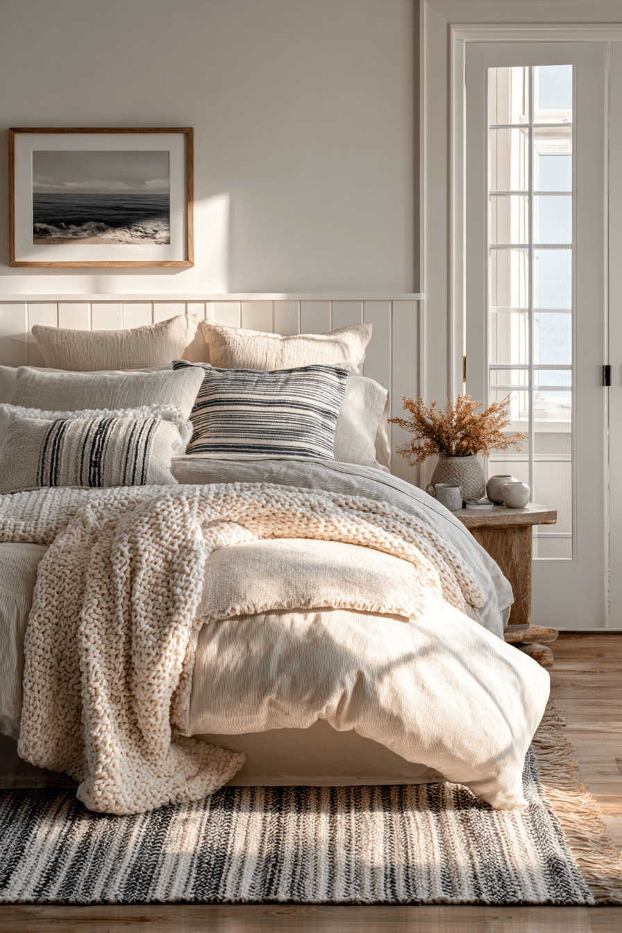 A cozy harbor-inspired theme brings a welcoming and relaxed vibe to this beach house bedroom, perfect for unwinding after a long day. Soft neutral tones like cream, beige, and light gray are accented with hints of blue for a subtle nod to the sea. Layered textures such as linen bedding, knit throws, and plush cushions create a sense of warmth and comfort. Classic coastal elements like simple stripes or understated nautical details add character without overpowering the design. Clean lines keep the space feeling open while still maintaining its cozy appeal. Natural light enhances the warm palette, making the room feel even more inviting and serene. Click to discover this cozy coastal retreat!