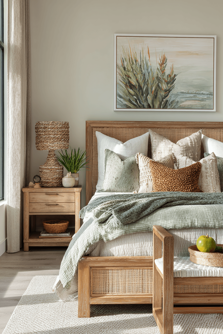 A tropical-inspired palette adds warmth and vibrancy to this beach house bedroom while maintaining a clean, modern edge. Soft greens, warm wood tones, and hints of earthy neutrals create a balanced and inviting look. Clean-lined furniture keeps the space feeling polished and uncluttered, allowing the colors to stand out. Natural textures like rattan, linen, and woven decor add comfort and depth to the design. Subtle tropical accents enhance the theme while keeping it sophisticated. The atmosphere feels fresh, relaxed, and welcoming, like a refined island retreat. Click to explore this tropical bedroom vibe!