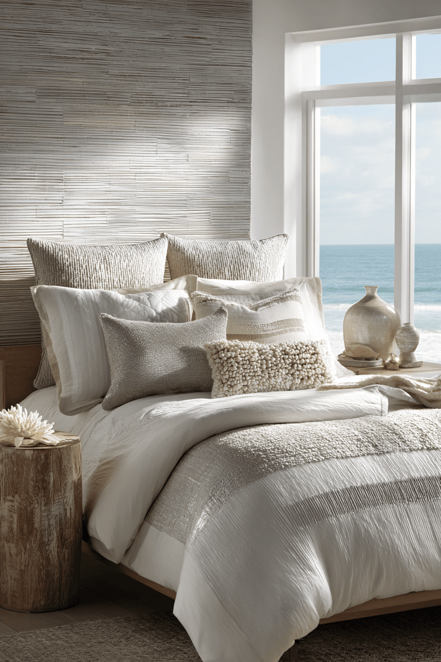 Soft pearl-inspired tones bring a touch of elegance to this beach house bedroom while maintaining a relaxed coastal feel. Light grays, creamy whites, and subtle metallic accents create a clean and sophisticated palette. Natural textures like wood, linen, and woven elements add warmth and prevent the space from feeling too formal. Layered bedding and soft decor enhance the cozy yet polished atmosphere. The design feels refined but still comfortable and approachable. Sunlight enhances the gentle tones beautifully, creating a soft shimmer across the room. Explore this elegant coastal bedroom!
