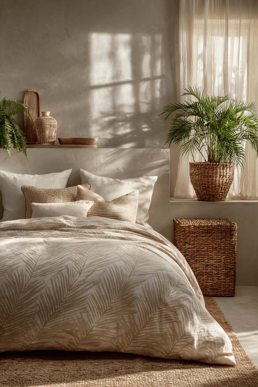 Soft palm-inspired shadows add a relaxed and tropical feel to this beach house bedroom, creating a subtle sense of movement and warmth. Neutral tones like sand, cream, and soft beige are layered with hints of green for a fresh and organic palette. Gentle palm patterns or shadow-like prints appear in textiles or decor, adding visual interest without overwhelming the space. Natural textures such as rattan furniture, linen bedding, and woven baskets enhance the laid-back atmosphere. Light filters softly through sheer curtains, casting beautiful shadows that mimic the feel of a breezy island setting. The space feels calm, breezy, and effortlessly inviting with a hint of tropical charm. Tap to experience this tropical bedroom design!