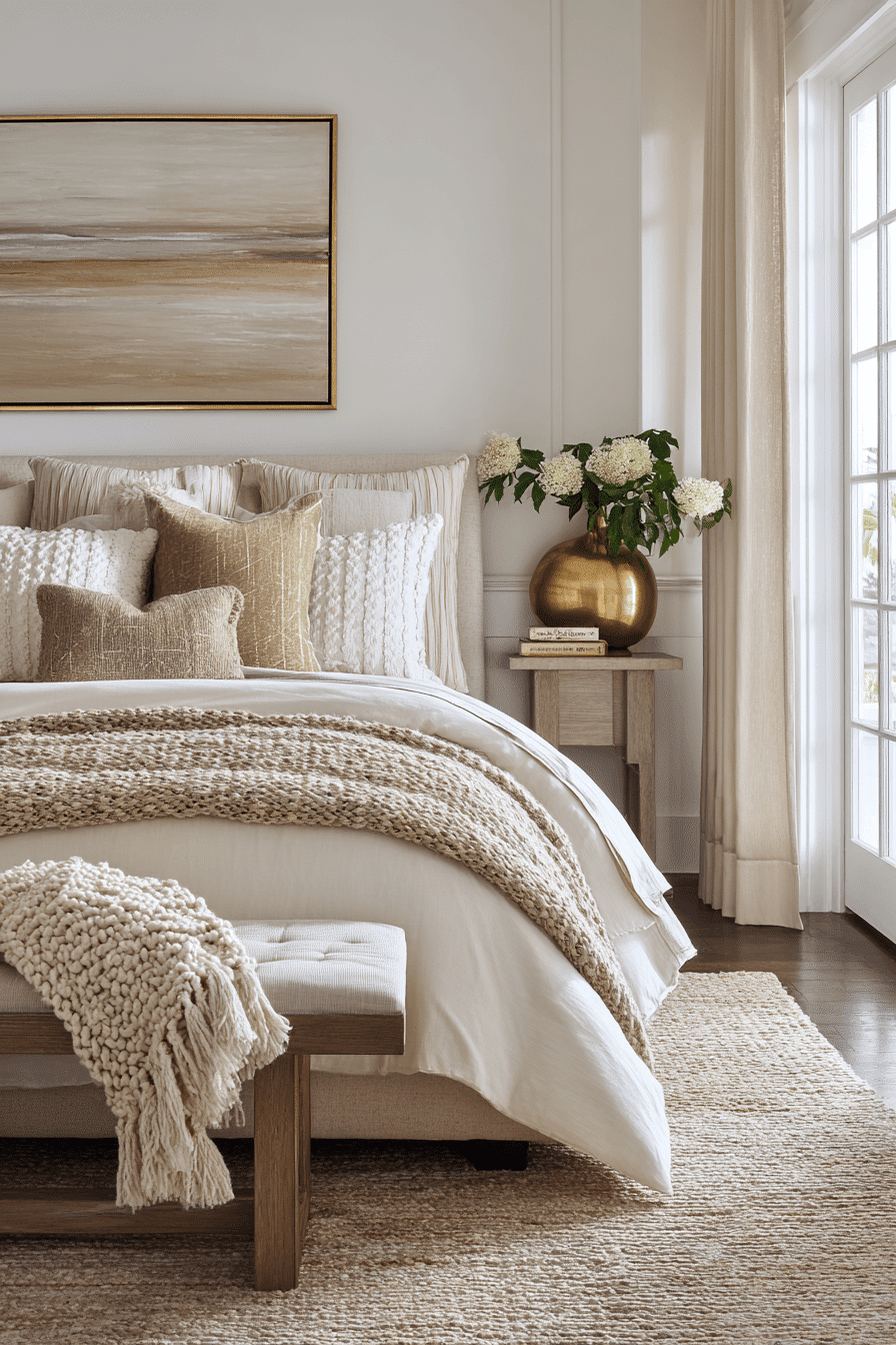 Golden tones bring warmth and depth to this beach house bedroom, creating a cozy yet modern atmosphere that feels both inviting and elevated. Soft neutrals like ivory and beige are paired with warm wood finishes and golden accents for a rich, layered look. Textured fabrics such as linen bedding, knit throws, and plush rugs add comfort and visual interest. Subtle metallic touches or sun-kissed hues reflect natural light beautifully, enhancing the glow of the room. Natural elements like wood furniture and organic decor pieces ground the design and add authenticity. The space feels warm, relaxed, and filled with soft light that enhances every detail. Discover this warm coastal bedroom style!