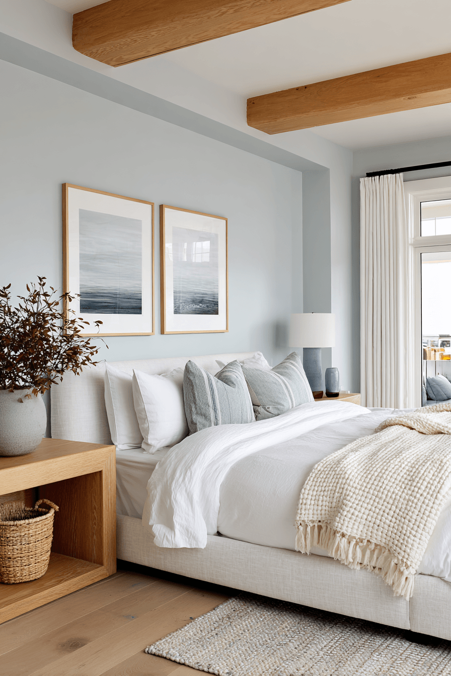 A gentle ocean-inspired palette brings a refreshing energy to this beach house bedroom, making it feel like a true seaside escape. Soft blues and sandy neutrals layer seamlessly across bedding, walls, and decor to create a soothing visual rhythm. Woven textures such as rattan headboards, linen curtains, and natural fiber rugs add warmth and tactile depth. Clean-lined furniture keeps the design modern while still maintaining a cozy, lived-in feel. Subtle coastal accents like glass decor, driftwood elements, or abstract ocean art complete the look without clutter. The room feels open, light-filled, and incredibly relaxing, perfect for unwinding at the end of the day. Tap to explore this breezy bedroom style!