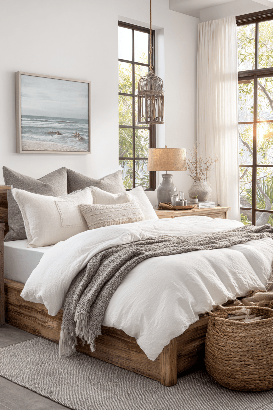 Warm driftwood tones anchor this beach house bedroom, adding a natural and grounded feel that connects the space to coastal surroundings. Paired with soft whites, muted grays, and layered neutrals, the palette feels both modern and timeless. Textured accents like woven baskets, linen throws, and handcrafted decor pieces create a cozy yet polished atmosphere. The natural grain of wood furniture becomes a focal point, adding depth and authenticity to the design. Large windows invite in abundant natural light, highlighting the beauty of each material and texture. The space feels relaxed, organic, and effortlessly chic, perfect for a laid-back coastal lifestyle. Discover this driftwood-inspired bedroom design!