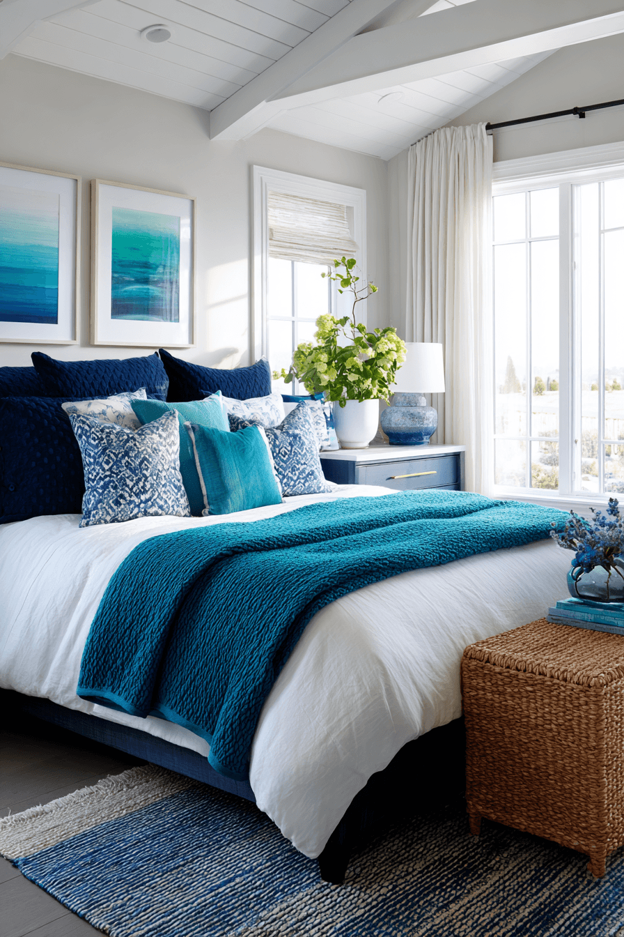 This vibrant take on a beach house bedroom introduces bold coastal hues that energize the space while still feeling cohesive and stylish. Deep navy blues, soft aquas, and crisp whites are layered thoughtfully across bedding, decor, and accent pieces. Sleek furniture silhouettes keep the design contemporary, allowing the colors to take center stage without feeling overwhelming. Natural textures like woven rugs, wood finishes, and soft linens help balance the bold tones. Strategic pops of color in artwork or pillows create visual movement throughout the room. The atmosphere feels fresh, lively, and modern while still maintaining a coastal charm. Click to see this bold coastal bedroom idea!
