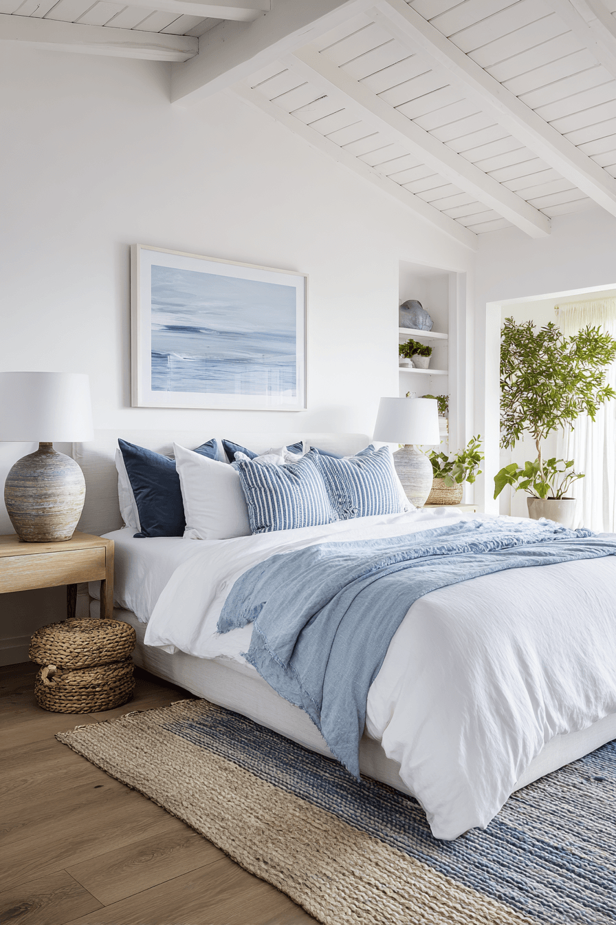 This crisp design embraces clean lines and fresh tones, making the beach house bedroom feel modern, polished, and effortlessly stylish. Whites and soft blues create a bright, cohesive palette that feels both timeless and refreshing. Minimal decor keeps the space uncluttered, allowing the simplicity of the design to stand out. Carefully chosen accents like subtle coastal artwork or textured pieces add personality without overwhelming the room. Natural textures such as linen, wood, and woven elements introduce warmth and depth. The room feels open, airy, and perfectly balanced between modern design and coastal comfort. Explore this fresh coastal bedroom look!