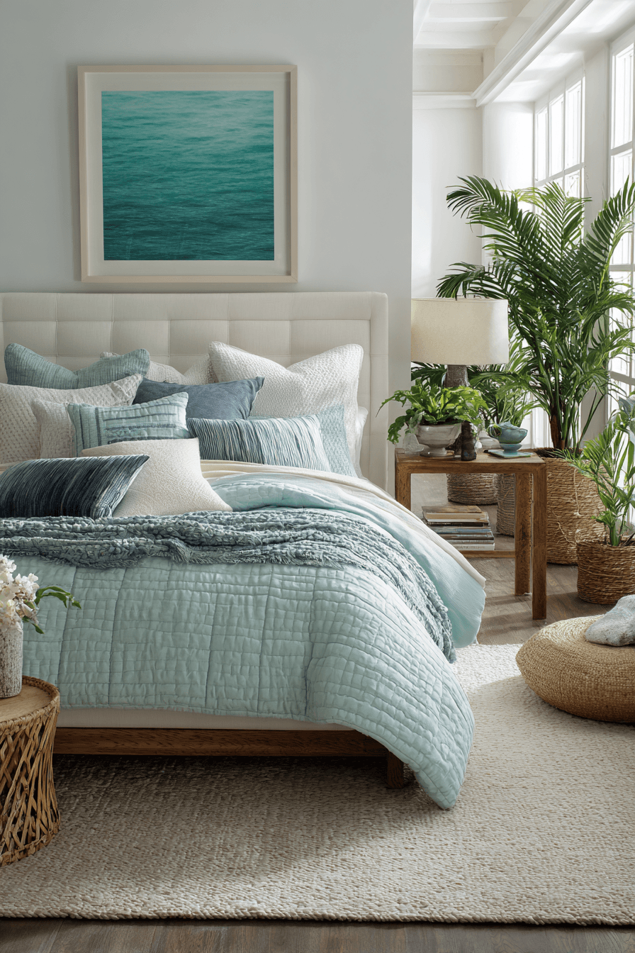 A calming aqua palette transforms this beach house bedroom into a soothing oasis that feels both modern and deeply relaxing. Soft bedding in layered tones of blue and white creates a serene and cohesive look. Plush textures like cozy throws, padded headboards, and soft rugs make the space feel inviting and comfortable. Natural materials such as wood, rattan, and woven accents add depth and authenticity to the design. Subtle decor pieces inspired by water and sky enhance the tranquil atmosphere. Sunlight enhances the cool tones, giving the room a refreshing and airy glow throughout the day. Discover how to create this serene bedroom vibe!