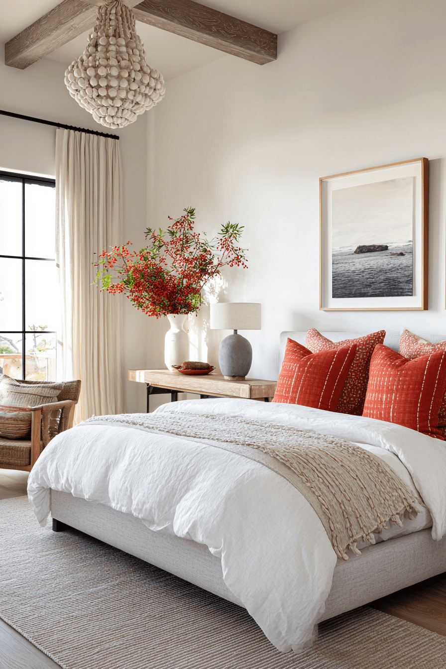 Coral-inspired accents add a vibrant and playful touch to this beach house bedroom, bringing warmth and personality into the design. Pops of coral in pillows, artwork, or decor are beautifully balanced with soft whites and neutral tones. Sleek furniture and minimal styling keep the room feeling modern and uncluttered. Natural textures like linen, wood, and woven materials add comfort and visual interest. The contrast between bold accents and soft surroundings creates a dynamic yet harmonious look. The atmosphere feels cheerful, inviting, and full of life without being overwhelming. Tap to bring this coral-inspired style into your home!