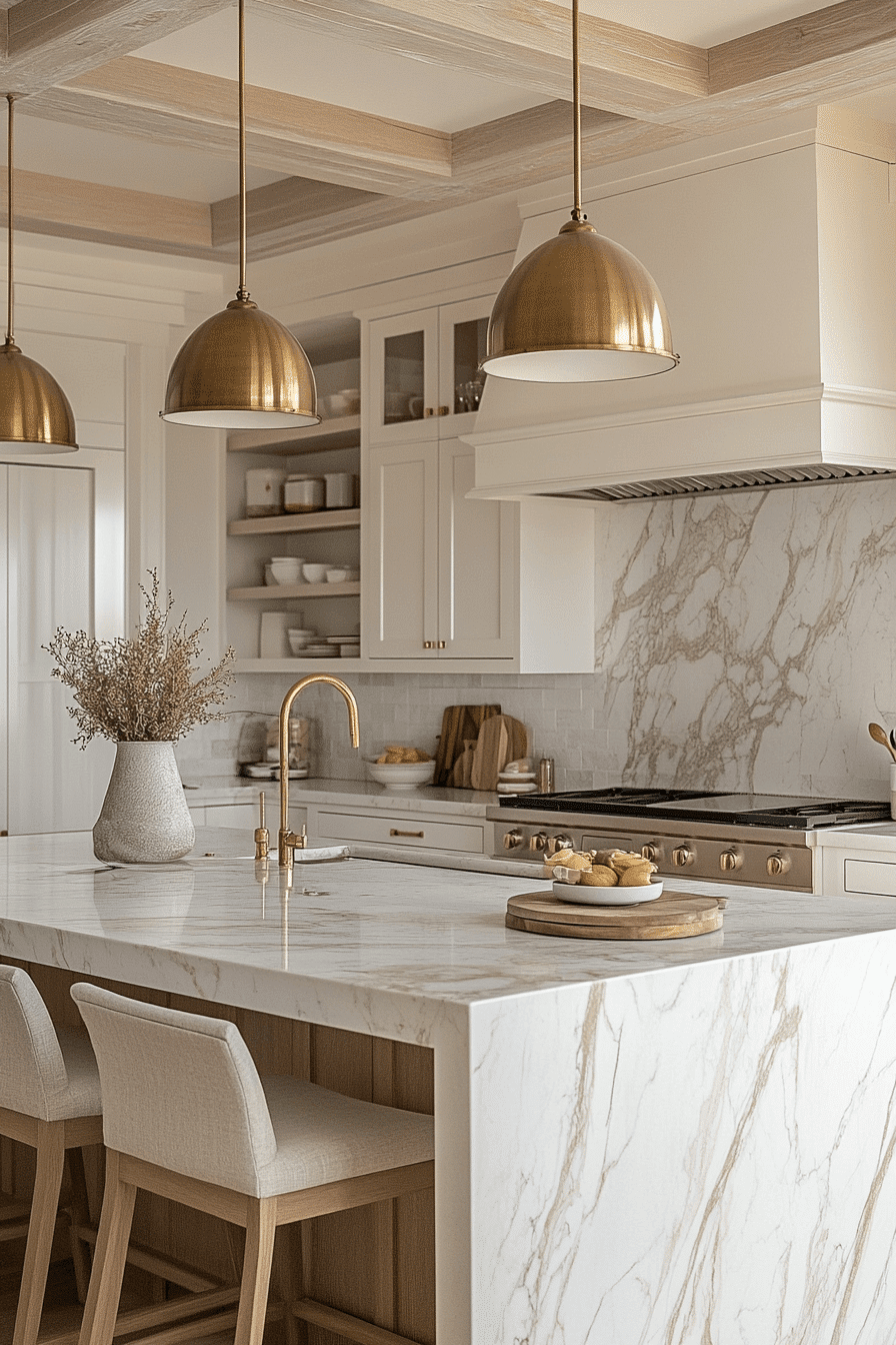 A Coastal Luxe Kitchen brings an elevated, polished touch to beach house kitchens by combining refined materials with a breezy coastal palette. Marble countertops with soft veining create a stunning focal point, while gold or brushed brass hardware adds warmth and understated glamour. Custom cabinetry with clean lines and premium finishes enhances the tailored, high-end feel of the space. Layered lighting, from statement pendants to subtle under-cabinet glow, creates depth and a soft, inviting ambiance. Neutral tones like ivory, sand, and pale taupe keep the design grounded while still feeling sophisticated and airy. The overall mood is glamorous yet relaxed, offering a perfect balance between luxury and laid-back coastal living. Discover how to achieve this luxurious beach-inspired kitchen!