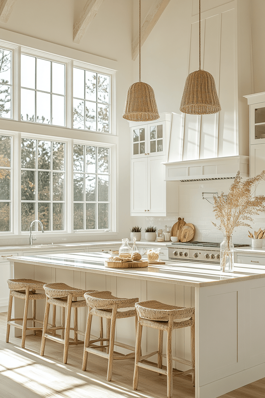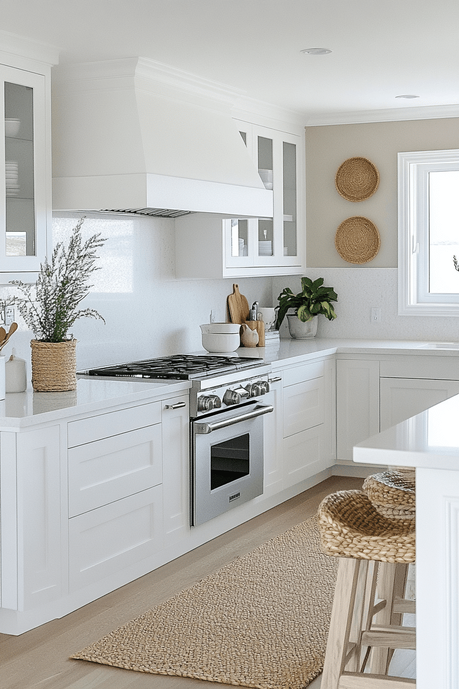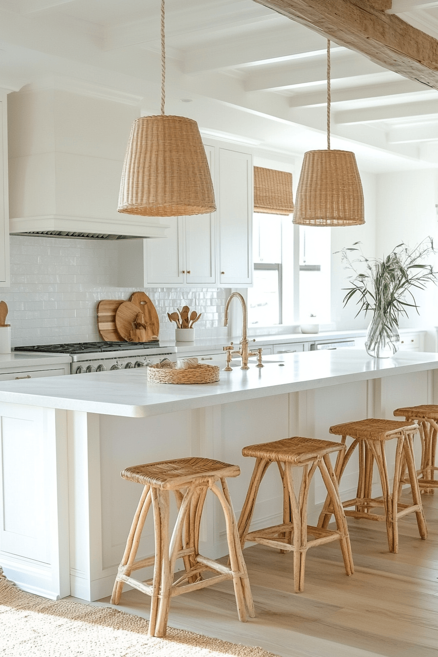 A Breezy White Kitchen is a timeless favorite among beach house kitchens, delivering a crisp, clean aesthetic that feels endlessly fresh. All-white cabinetry, countertops, and walls reflect natural light beautifully, instantly making the space feel larger and more open. To soften the look, natural textures like light wood stools, woven baskets, or rattan lighting introduce warmth and subtle contrast. Gentle coastal accents, such as glass vases or soft blue decor, add just the right amount of personality without overwhelming the palette. The simplicity of the design allows light and space to take center stage. The atmosphere feels bright, calming, and effortlessly inviting, like a sunlit coastal retreat. Click to brighten your space with this classic coastal look!