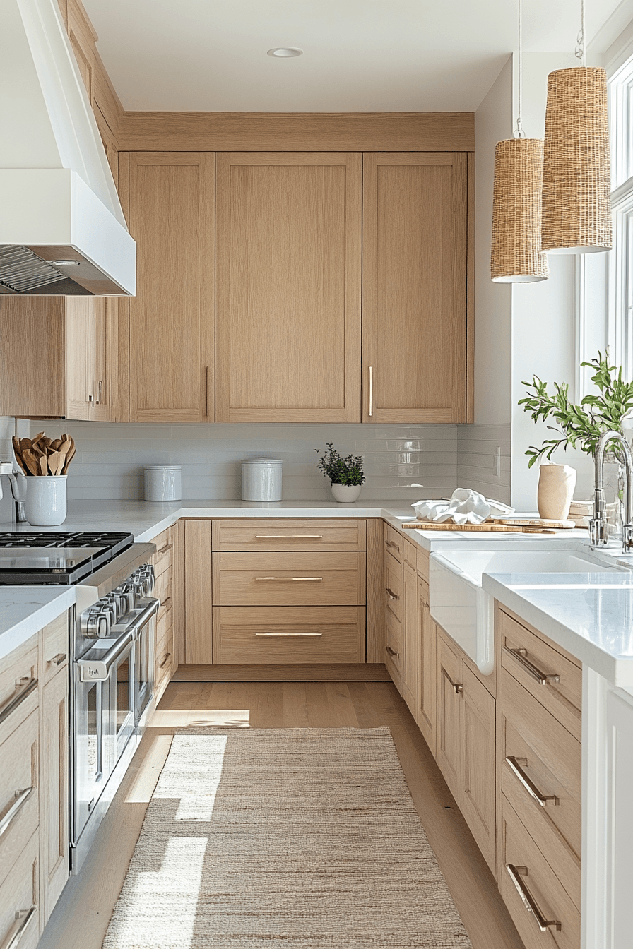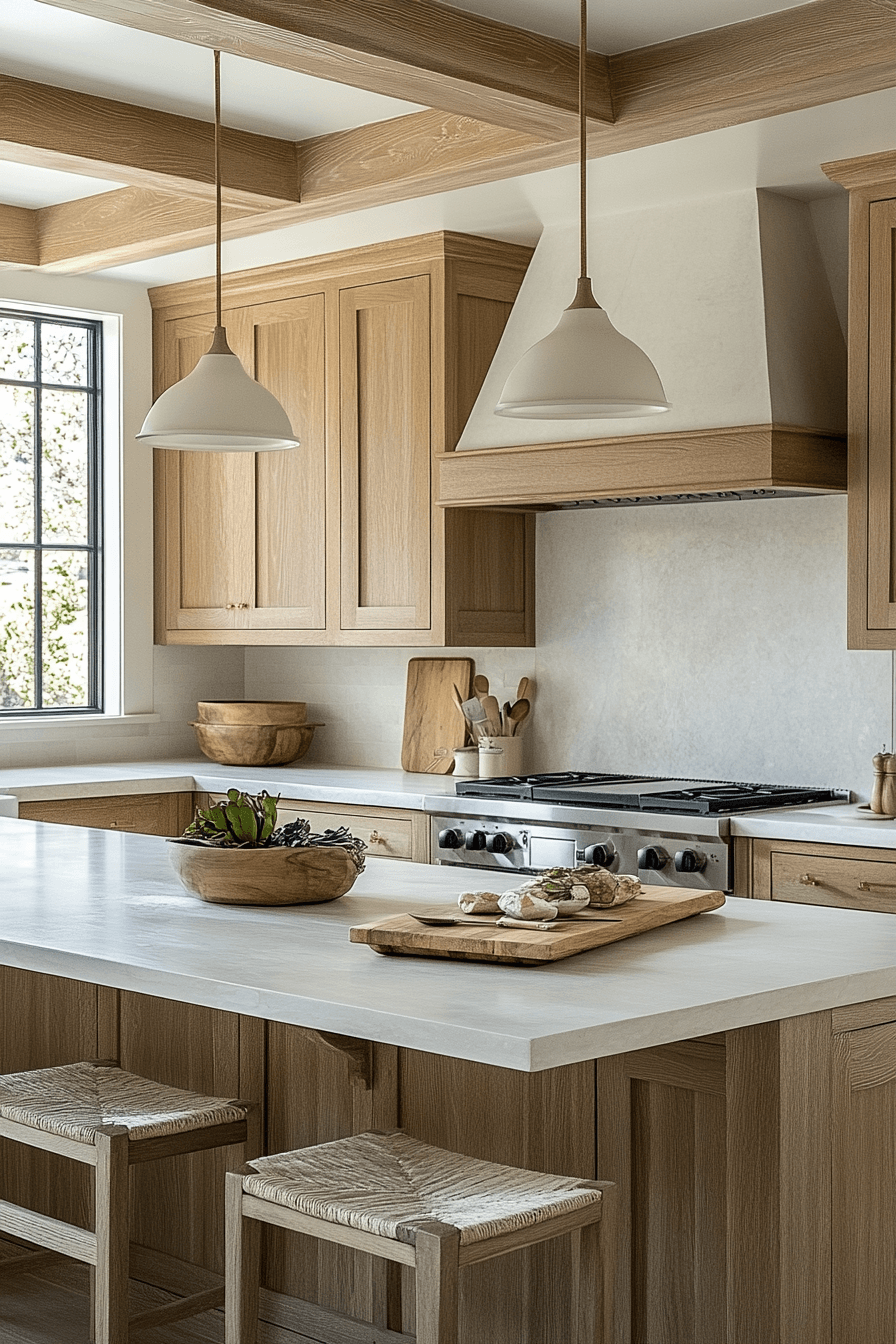 A Pale Wood Kitchen introduces organic warmth into modern beach house kitchens while maintaining a light and airy feel. Light oak, maple, or ash cabinetry showcases subtle grain patterns that add natural texture without darkening the space. Paired with white countertops and soft neutral accents, the design feels fresh, balanced, and effortlessly modern. The warmth of the wood contrasts gently with cooler coastal tones, creating visual harmony. Natural finishes help reinforce a connection to the outdoors, enhancing the overall coastal aesthetic. The result is a kitchen that feels cozy, refined, and beautifully grounded. Click to explore this warm coastal kitchen style!